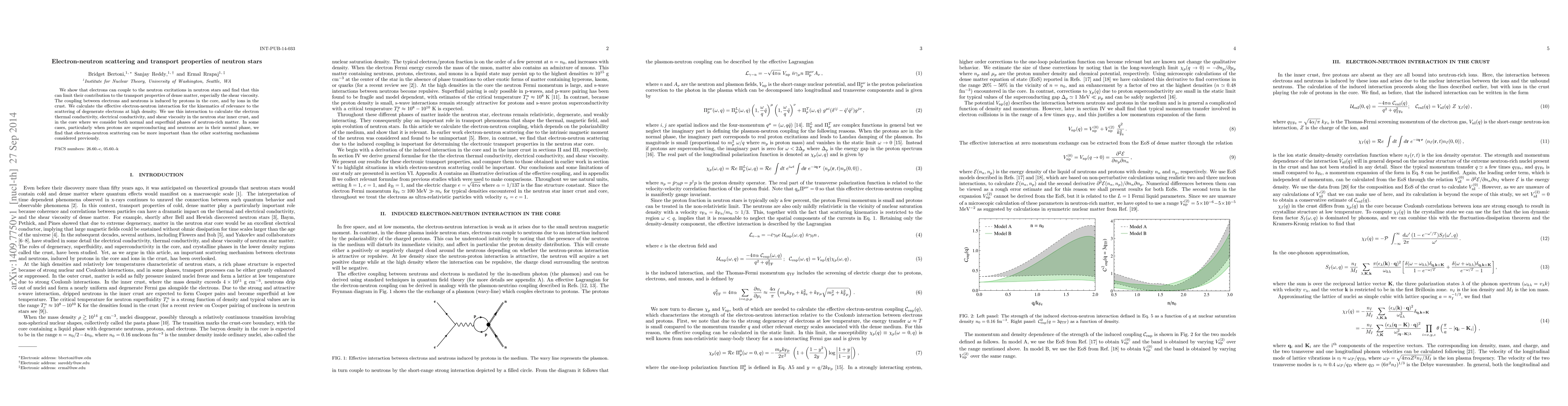 We show that electrons can couple to the neutron excitations in neutron stars and find that this can limit their contribution to the transport properties of dense matter, especially the shear viscosity. The coupling between electrons and neutrons is induced by protons in the core, and by ions in the crust. We calculate the effective electron-neutron interaction for the kinematics of relevance to the scattering of degenerate electrons at high density. We use this interaction to calculate the electron thermal conductivity, electrical conductivity, and shear viscosity in the neutron star inner crust, and in the core where we consider both normal and superfluid phases of neutron-rich matter. In some cases, particularly when protons are superconducting and neutrons are in their normal phase, we find that electron-neutron scattering can be more important than the other scattering mechanisms considered previously.