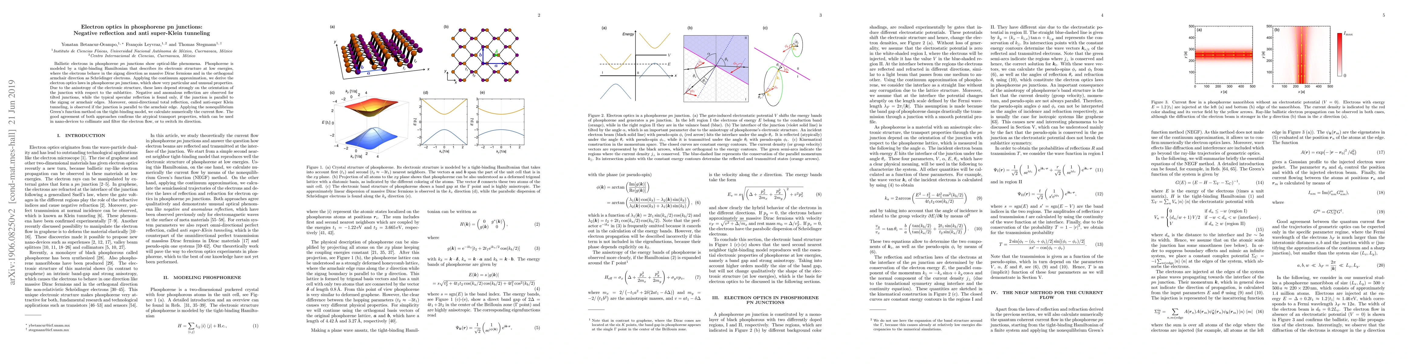 Ballistic electrons in phosphorene $pn$ junctions show optical-like phenomena. Phosphorene is modeled by a tight-binding Hamiltonian that describes its electronic structure at low energies, where the electrons behave in the zigzag direction as massive Dirac fermions and in the orthogonal armchair direction as Schr\"odinger electrons. Applying the continuum approximation, we derive the electron optics laws in phosphorene $pn$ junctions, which show very particular and unusual properties. Due to the anisotropy of the electronic structure, these laws depend strongly on the orientation of the junction with respect to the sublattice. Negative and anomalous reflection are observed for tilted junctions, while the typical specular reflection is found only, if the junction is parallel to the zigzag or armchair edges. Moreover, omni-directional total reflection, called anti-super Klein tunneling, is observed if the junction is parallel to the armchair edge. Applying the nonequilibrium Green's function method on the tight-binding model, we calculate numerically the current flow. The good agreement of both approaches confirms the atypical transport properties, which can be used in nano-devices to collimate and filter the electron flow, or to switch its direction.