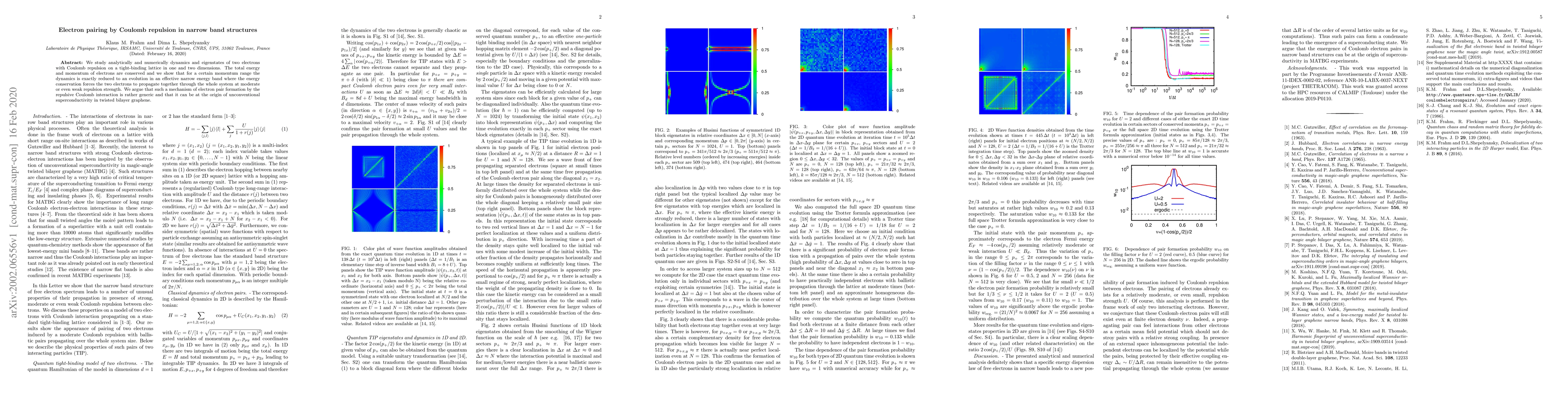 We study analytically and numerically dynamics and eigenstates of two electrons with Coulomb repulsion on a tight-binding lattice in one and two dimensions. The total energy and momentum of electrons are conserved and we show that for a certain momentum range the dynamics is exactly reduced to an evolution in an effective narrow energy band where the energy conservation forces the two electrons to propagate together through the whole system at moderate or even weak repulsion strength. We argue that such a mechanism of electron pair formation by the repulsive Coulomb interaction is rather generic and that it can be at the origin of unconventional superconductivity in twisted bilayer graphene.