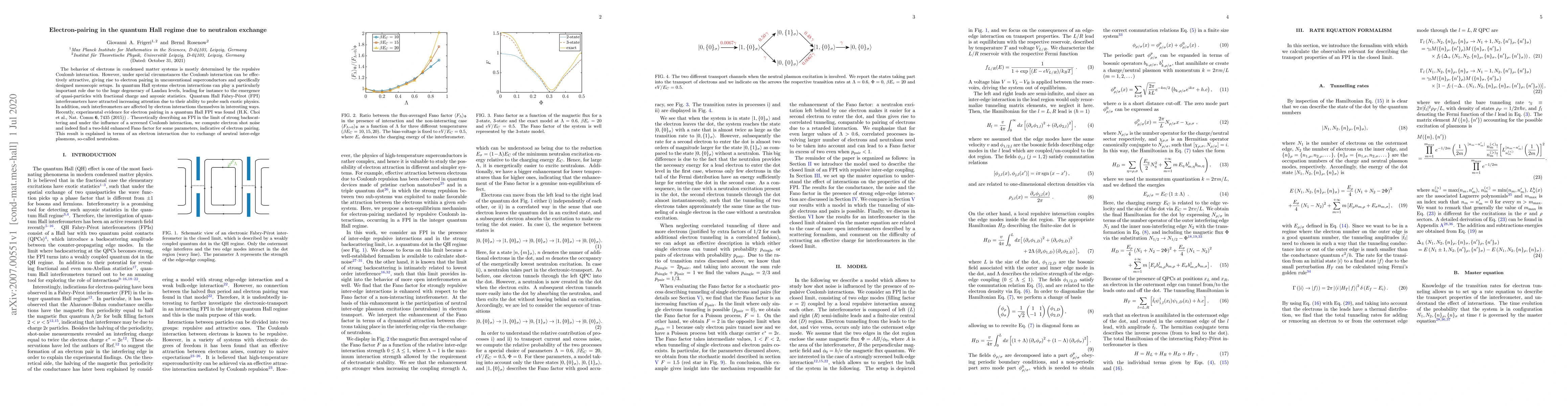 The paper investigates electron pairing in quantum Hall systems, showing that interactions via neutralon exchange can lead to a two-fold enhanced Fano factor, indicative of electron pairing, in Quantum Hall Fabry-Pérot interferometers. This phenomenon is explained through the influence of a screened Coulomb interaction in the regime of strong backscattering.