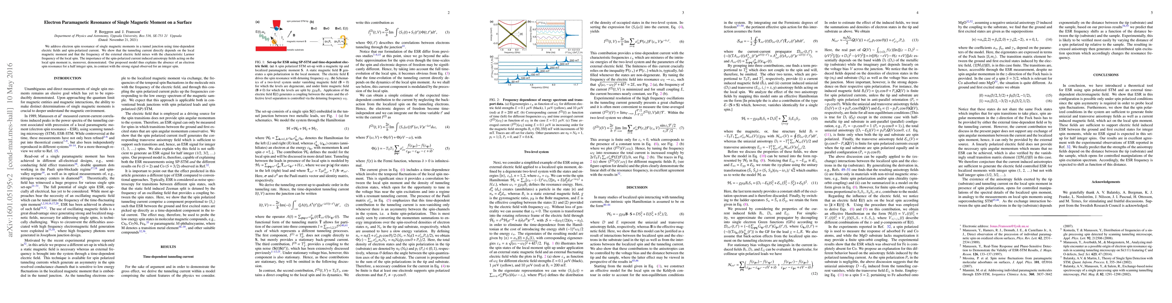 We address electron spin resonance of single magnetic moments in a tunnel junction using time-dependent electric fields and spin-polarized current. We show that the tunneling current directly depends on the local magnetic moment and that the frequency of the external electric field mixes with the characteristic Larmor frequency of the local spin. The importance of the spin-polarized current induced anisotropy fields acting on the local spin moment is, moreover, demonstrated. Our proposed model thus explains the absence of an electron spin resonance for a half integer spin, in contrast with the strong signal observed for an integer spin.