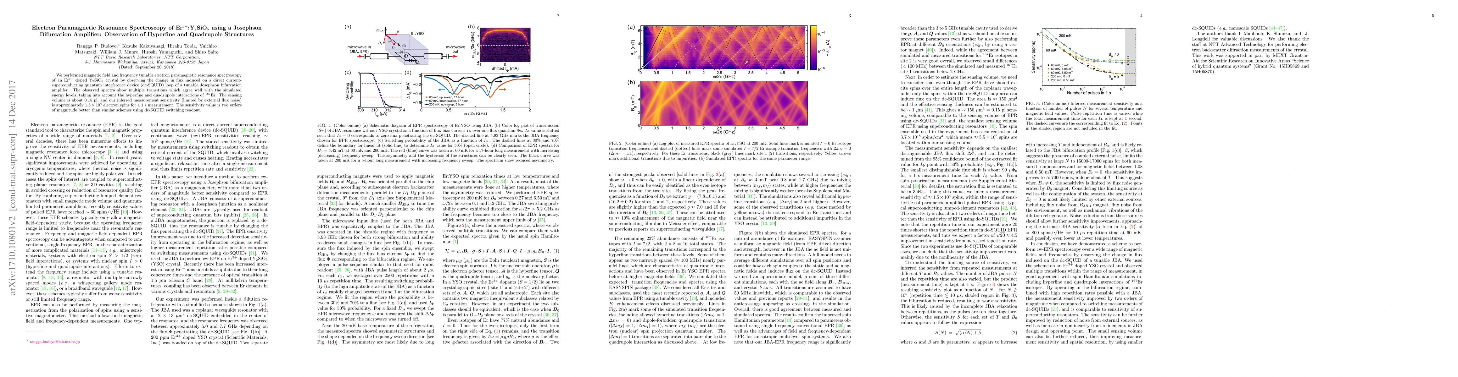 This study uses a Josephson bifurcation amplifier to perform magnetic field and frequency tunable electron paramagnetic resonance spectroscopy on Er$^{3+}$ doped Y$_2$SiO$_5$, revealing hyperfine and quadrupole structures. The enhanced sensitivity of the method is two orders of magnitude better than conventional dc-SQUID switching readout techniques.