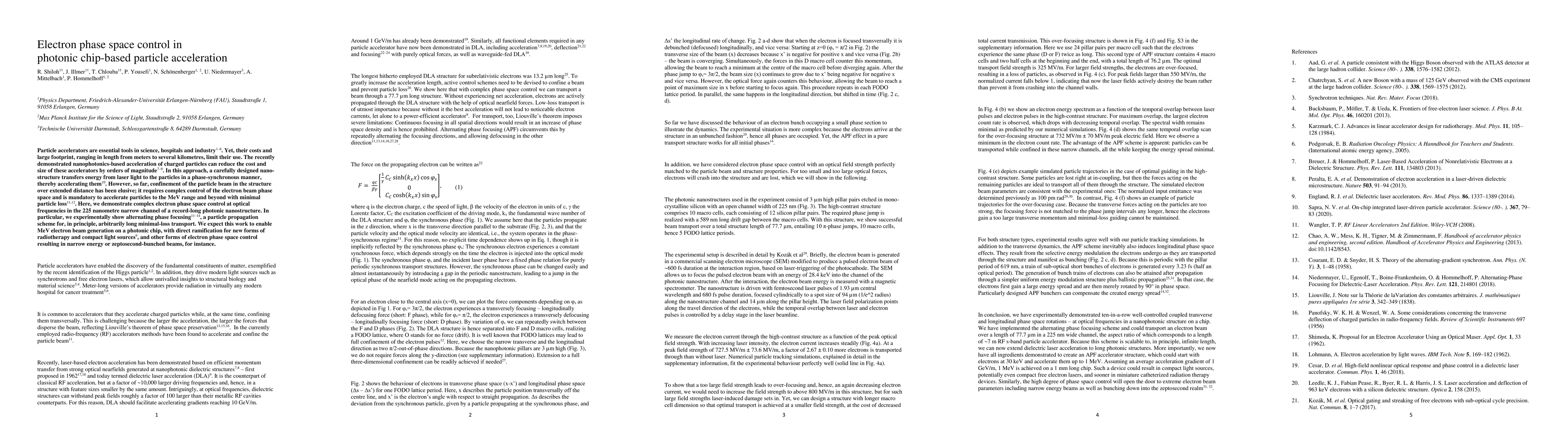 Particle accelerators are essential tools in science, hospitals and industry. Yet, their costs and large footprint, ranging in length from meters to several kilometres, limit their use. The recently demonstrated nanophotonics-based acceleration of charged particles can reduce the cost and size of these accelerators by orders of magnitude. In this approach, a carefully designed nano-structure transfers energy from laser light to the particles in a phase-synchronous manner, thereby accelerating them. However, so far, confinement of the particle beam in the structure over extended distance has been elusive; it requires complex control of the electron beam phase space and is mandatory to accelerate particles to the MeV range and beyond with minimal particle loss. Here, we demonstrate complex electron phase space control at optical frequencies in the 225 nanometre narrow channel of a record-long photonic nanostructure. In particular, we experimentally show alternating phase focusing, a particle propagation scheme for, in principle, arbitrarily long minimal-loss transport. We expect this work to enable MeV electron beam generation on a photonic chip, with direct ramification for new forms of radiotherapy and compact light sources, and other forms of electron phase space control resulting in narrow energy or zeptosecond-bunched beams, for instance.