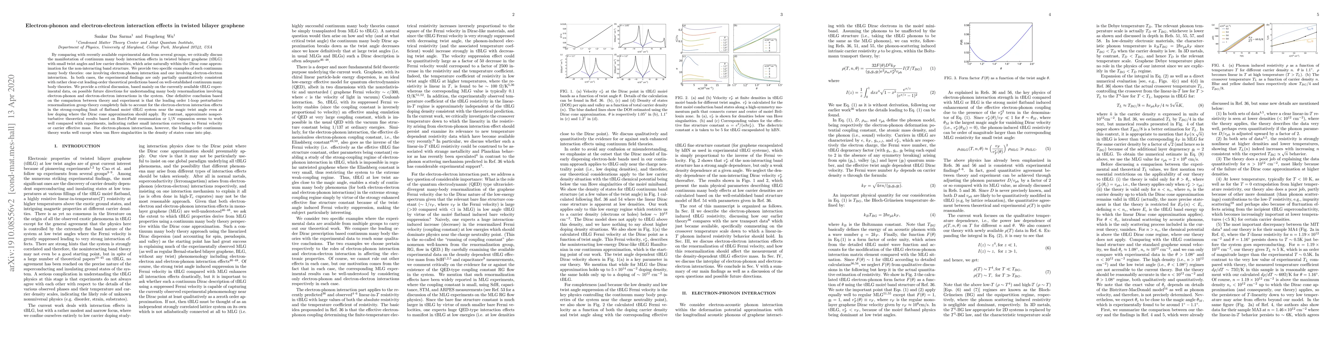 This research examines continuum many-body interaction effects in twisted bilayer graphene (tBLG) using Dirac cone approximation, focusing on electron-phonon and electron-electron interactions. While leading-order theories partially match experimental data, they fail for electron-electron interactions near the magic twist angle, while nonperturbative methods show better agreement. Electron-phonon interactions align well with theory, except near van Hove singularities.