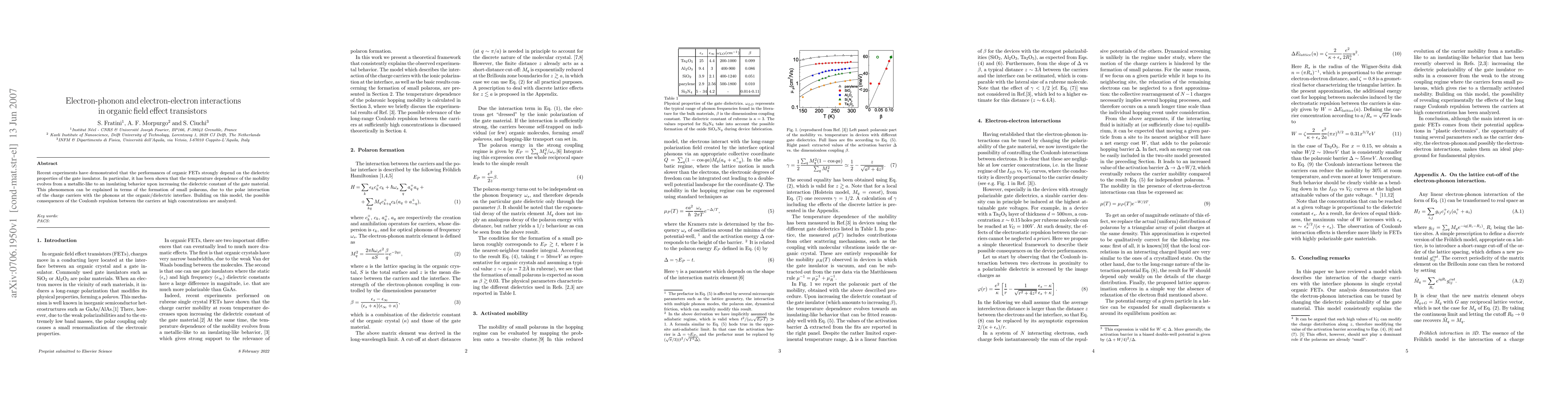 This paper investigates how electron-phonon and electron-electron interactions influence the performance of organic field effect transistors (FETs) by examining the temperature dependence of carrier mobility. It finds that increasing the dielectric constant of the gate material shifts mobility behavior from metallic to insulating, attributed to the formation of small polarons due to phonon interactions, and explores the impact of carrier Coulomb repulsion at high concentrations.