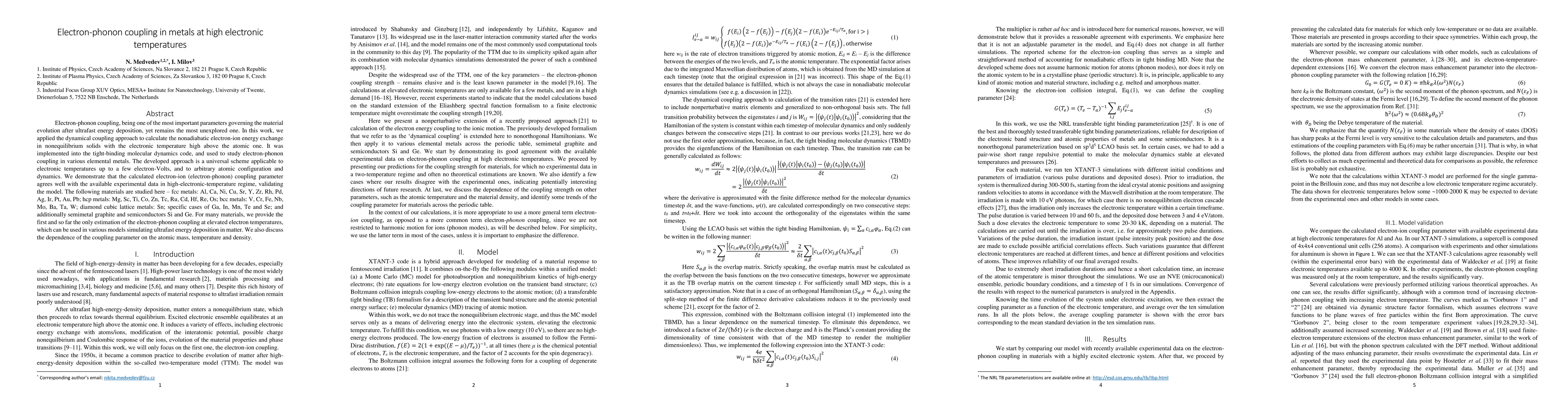 Electron-phonon coupling, being one of the most important parameters governing the material evolution after ultrafast energy deposition, yet remains the most unexplored one. In this work, we applied the dynamical coupling approach to calculate the nonadiabatic electron-ion energy exchange in nonequilibrium solids with the electronic temperature high above the atomic one. It was implemented into the tight-binding molecular dynamics code, and used to study electron-phonon coupling in various elemental metals. The developed approach is a universal scheme applicable to electronic temperatures up to a few electron-Volts, and to arbitrary atomic configuration and dynamics. We demonstrate that the calculated electron-ion (electron-phonon) coupling parameter agrees well with the available experimental data in high-electronic-temperature regime, validating the model. The following materials are studied here - fcc metals: Al, Ca, Ni, Cu, Sr, Y, Zr, Rh, Pd, Ag, Ir, Pt, Au, Pb; hcp metals: Mg, Sc, Ti, Co, Zn, Tc, Ru, Cd, Hf, Re, Os; bcc metals: V, Cr, Fe, Nb, Mo, Ba, Ta, W; diamond cubic lattice metals: Sn; specific cases of Ga, In, Mn, Te and Se; and additionally semimetal graphite and semiconductors Si and Ge. For many materials, we provide the first and so far the only estimation of the electron-phonon coupling at elevated electron temperatures, which can be used in various models simulating ultrafast energy deposition in matter. We also discuss the dependence of the coupling parameter on the atomic mass, temperature and density.