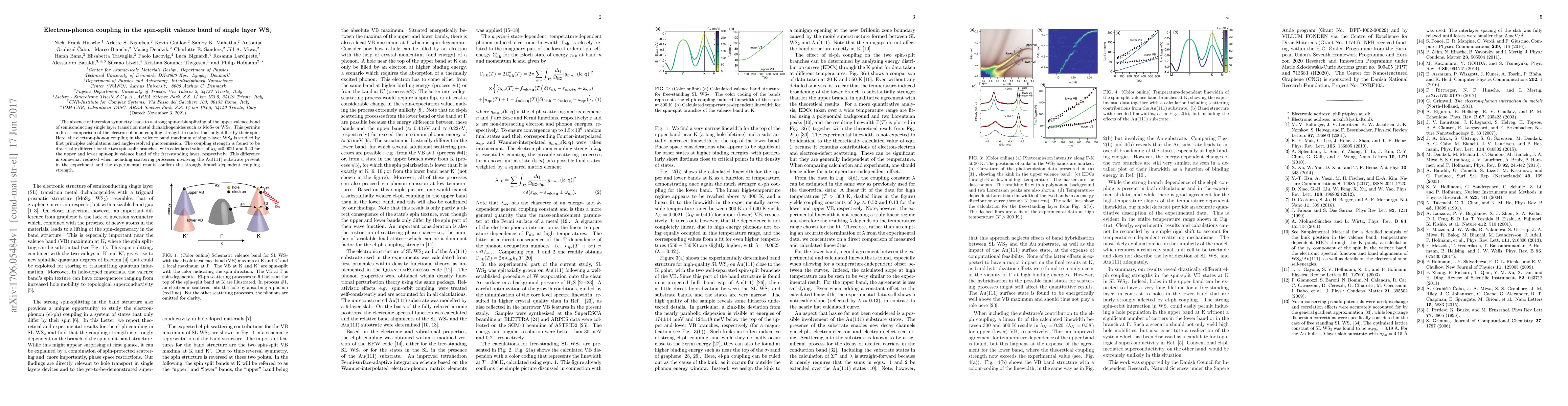 The absence of inversion symmetry leads to a strong spin-orbit splitting of the upper valence band of semiconducting single layer transition metal dichalchogenides such as MoS$_2$ or WS$_2$. This permits a direct comparison of the electron-phonon coupling strength in states that only differ by their spin. Here, the electron-phonon coupling in the valence band maximum of single-layer WS$_2$ is studied by first principles calculations and angle-resolved photoemission. The coupling strength is found to be drastically different for the two spin-split branches, with calculated values of $\lambda_K=$0.0021 and 0.40 for the upper and lower spin-split valence band of the free-standing layer, respectively. This difference is somewhat reduced when including scattering processes involving the Au(111) substrate present in the experiment and the experimental results confirm the strongly branch-dependent coupling strength.