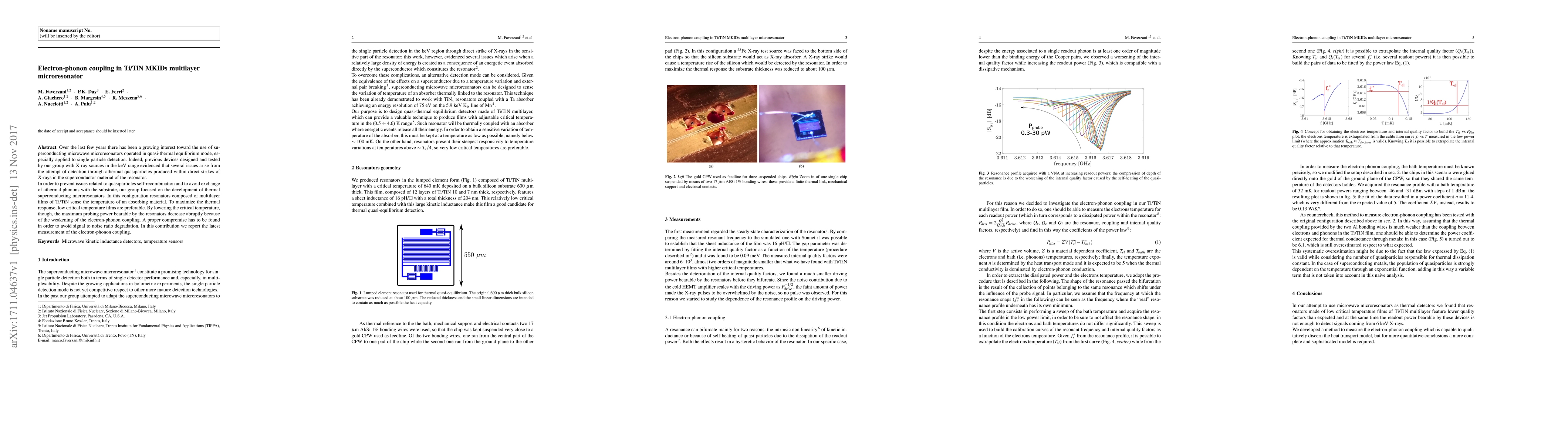 Over the last few years there has been a growing interest toward the use of superconducting microwave microresonators operated in quasi-thermal equilibrium mode, especially applied to single particle detection. Indeed, previous devices designed and tested by our group with X-ray sources in the keV range evidenced that several issues arise from the attempt of detection through athermal quasiparticles produced within direct strikes of X-rays in the superconductor material of the resonator. In order to prevent issues related to quasiparticles self-recombination and to avoid exchange of athermal phonons with the substrate, our group focused on the development of thermal superconducting microresonators. In this configuration resonators composed of multilayer films of Ti/TiN sense the temperature of an absorbing material. To maximize the thermal response, low critical temperature films are preferable. By lowering the critical temperature, though, the maximum probing power bearable by the resonators decrease abruptly because of the weakening of the electron-phonon coupling. A proper compromise has to be found in order to avoid signal to noise ratio degradation. In this contribution we report the latest measurement of the electron-phonon coupling.