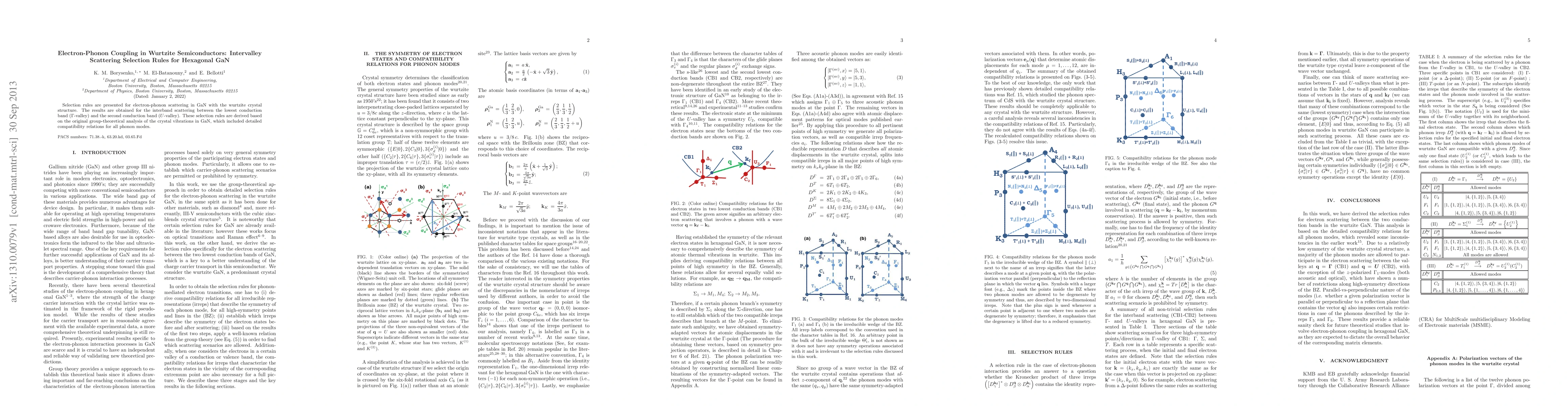 This paper presents selection rules for electron-phonon scattering in hexagonal GaN, focusing on interband transitions between the $\Gamma$-valley and $U$-valley. The rules are derived through a group-theoretical analysis of GaN's crystal vibrations, detailing compatibility relations for all phonon modes.