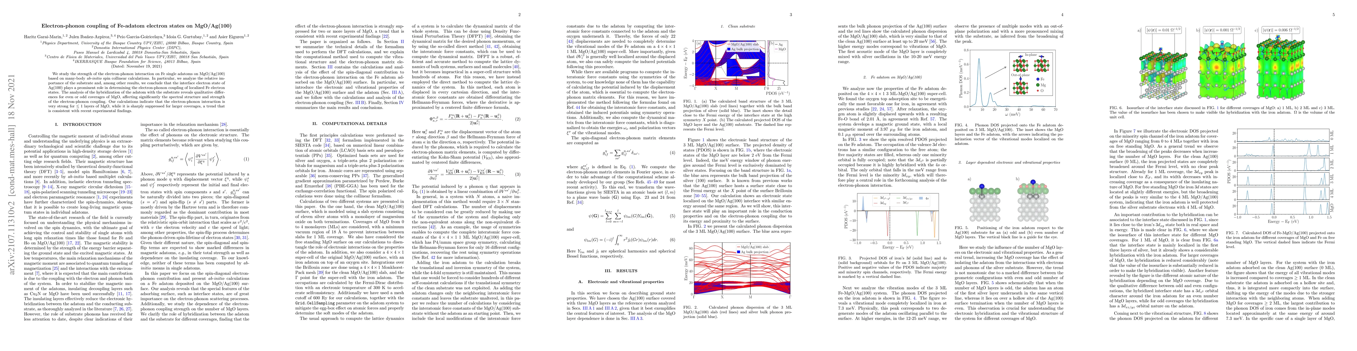 Researchers studied electron-phonon coupling on Fe single adatoms on MgO/Ag(100) using extit{ab-initio} spin collinear calculations, finding a strong interaction with interface electrons that varies with MgO coverage.