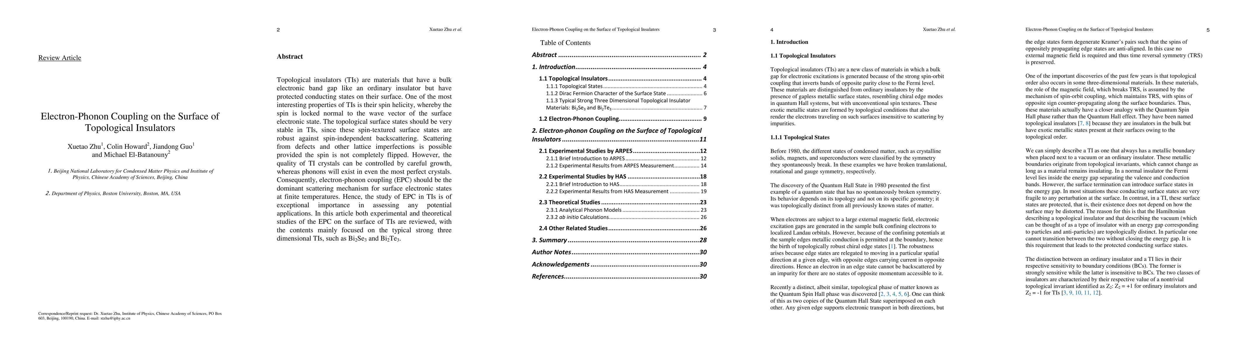 This paper reviews experimental and theoretical studies on electron-phonon coupling (EPC) in topological insulators (TIs), emphasizing its role as a dominant scattering mechanism for surface electronic states at finite temperatures. The focus is on strong three-dimensional TIs like Bi2Se3 and Bi2Te3, highlighting the importance of EPC in assessing TI applications.