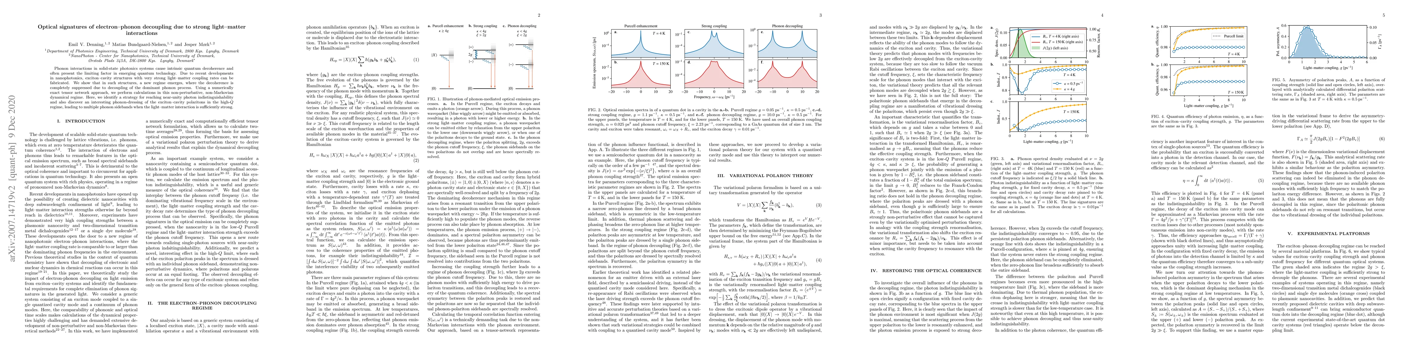 This paper demonstrates that strong light-matter interactions in exciton-cavity structures can lead to electron-phonon decoupling, suppressing phonon-induced decoherence. Using a tensor network approach, the researchers identify a regime where phonon interactions are minimized, achieving near-unity photon indistinguishability and revealing phonon-dressed polaritons with multiple phonon sidebands.