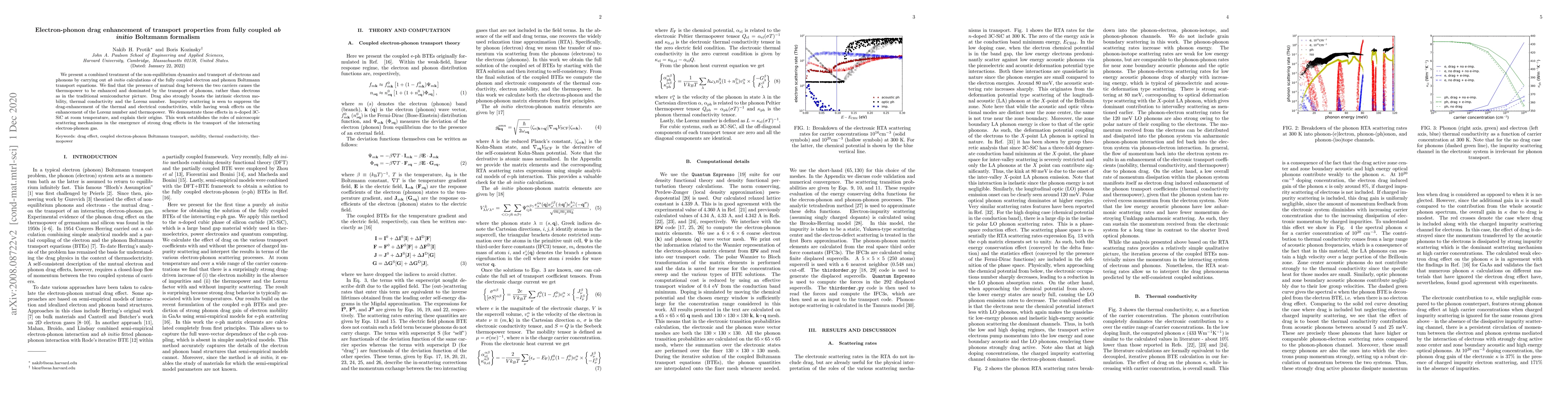 We present a combined treatment of the non-equilibrium dynamics and transport of electrons and phonons by carrying out \textit{ab initio} calculations of the fully coupled electron and phonon Boltzmann transport equations. We find that the presence of mutual drag between the two carriers causes the thermopower to be enhanced and dominated by the transport of phonons, rather than electrons as in the traditional semiconductor picture. Drag also strongly boosts the intrinsic electron mobility, thermal conductivity and the Lorenz number. Impurity scattering is seen to suppress the drag-enhancement of the thermal and electrical conductivities, while having weak effects on the enhancement of the Lorenz number and thermopower. We demonstrate these effects in \textit{n}-doped 3C-SiC at room temperature, and explain their origins. This work establishes the roles of microscopic scattering mechanisms in the emergence of strong drag effects in the transport of the interacting electron-phonon gas.