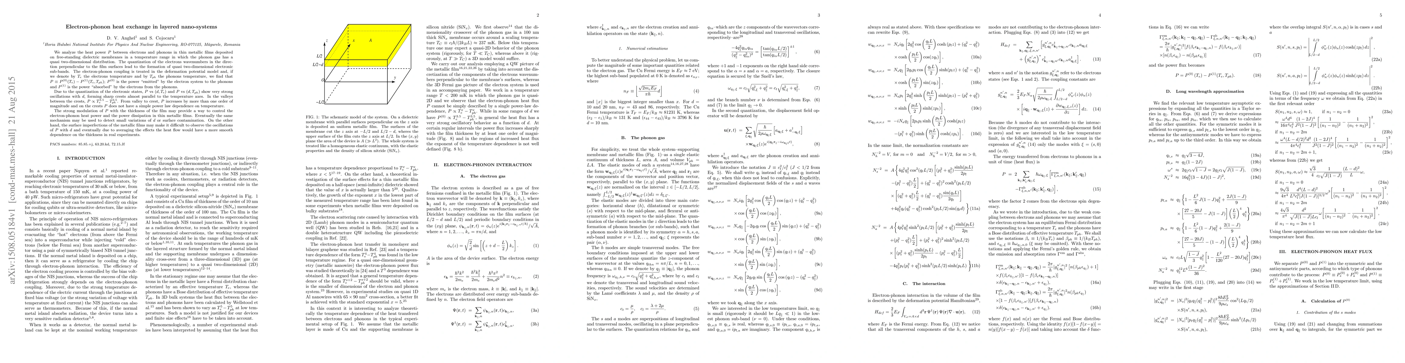 We analyze the heat power $P$ between electrons and phonons in thin metallic films deposited on free-standing dielectric membranes in a temperature range in which the phonon gas has a quasi two-dimensional distribution. The quantization of the electrons wavenumbers in the direction perpendicular to the film surfaces lead to the formation of quasi two-dimensional electronic sub-bands. The electron-phonon coupling is treated in the deformation potential model and, if we denote by $T_e$ the electrons temperature and by $T_{ph}$ the phonons temperature, we find that $P\equiv P^{(0)}(T_{e})-P^{(1)}(T_{e},T_{ph})$; $P^{(0)}$ is the power "emitted" by the electron system to the phonons and $P^{(1)}$ is the power "absorbed" by the electrons from the phonons. Due to the quantization of the electronic states, $P$ vs $(d,T_e)$ and $P$ vs $(d,T_{ph})$ show very strong oscillations with $d$, forming sharp crests almost parallel to the temperature axes. In the valleys between the crests, $P \propto T_e^{3.5} - T_{ph}^{3.5}$. From valley to crest, $P$ increases by more than one order of magnitude and on the crests $P$ does not have a simple power law dependence on temperature. The strong modulation of $P$ with the thickness of the film may provide a way to control the electron-phonon heat power and the power dissipation in thin metallic films. Eventually the same mechanism may be used to detect small variations of $d$ or surface contamination. On the other hand, the surface imperfections of the metallic films may make it difficult to observe the oscillations of $P$ with $d$ and eventually due to averaging the effects the heat flow would have a more smooth dependence on the thickness in real experiments.