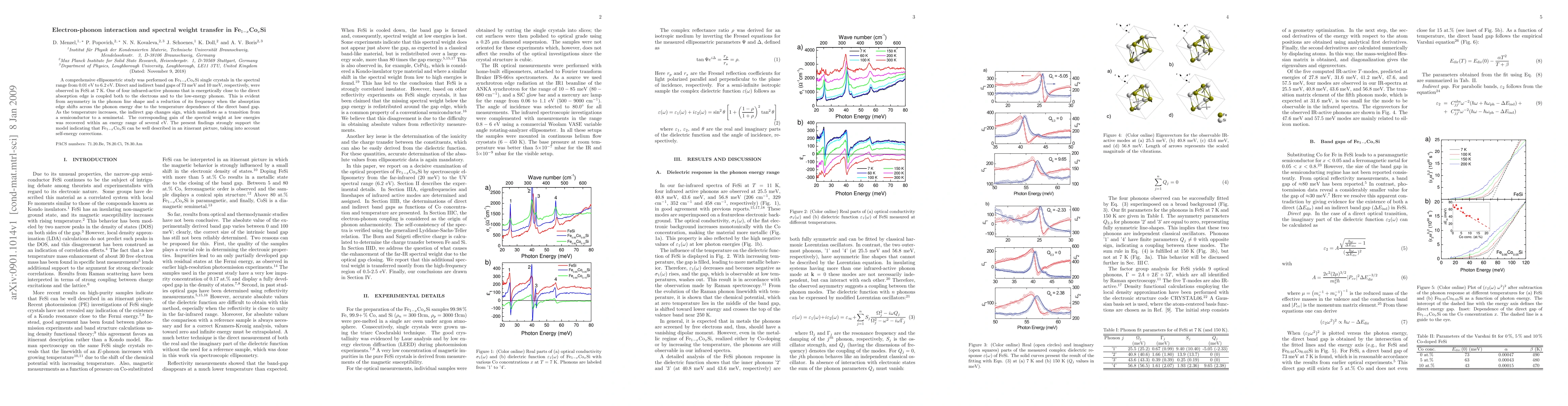 This study reveals electron-phonon coupling in Fe$_{1-x}$Co$_{x}$Si through ellipsometry, showing spectral weight transfer from a phonon near the direct band gap, leading to a transition from semiconductor to semimetal as temperature rises. The findings support an itinerant model for this material.