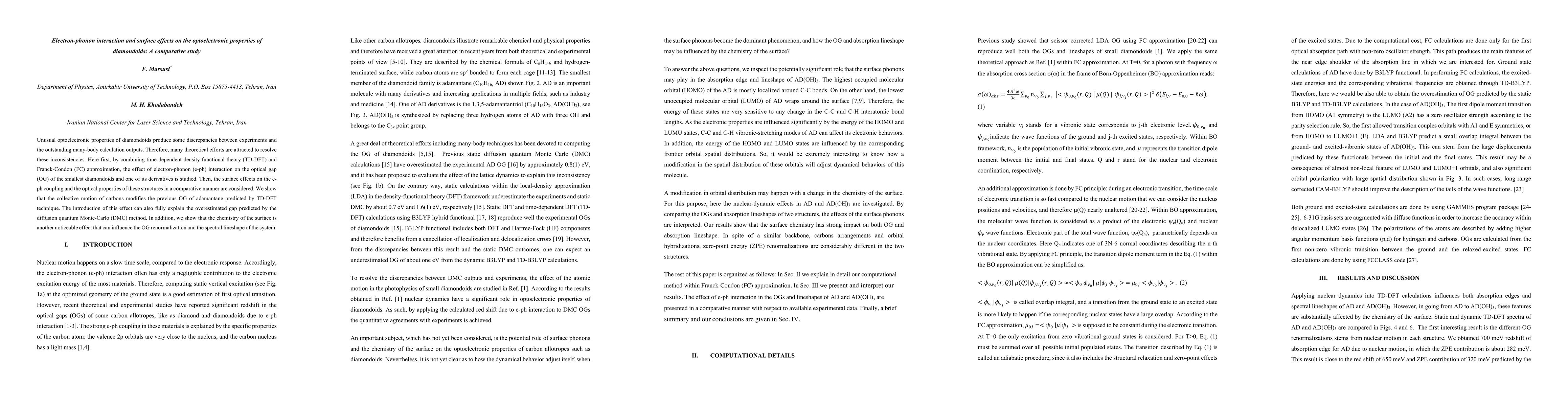 This paper investigates the electron-phonon interaction and surface effects on the optoelectronic properties of diamondoids using TD-DFT and FC approximation. It finds that the collective motion of carbon atoms modifies the optical gap of adamantane, resolving discrepancies between TD-DFT predictions and DMC calculations, and highlights the influence of surface chemistry on the optical gap and spectral lineshape.