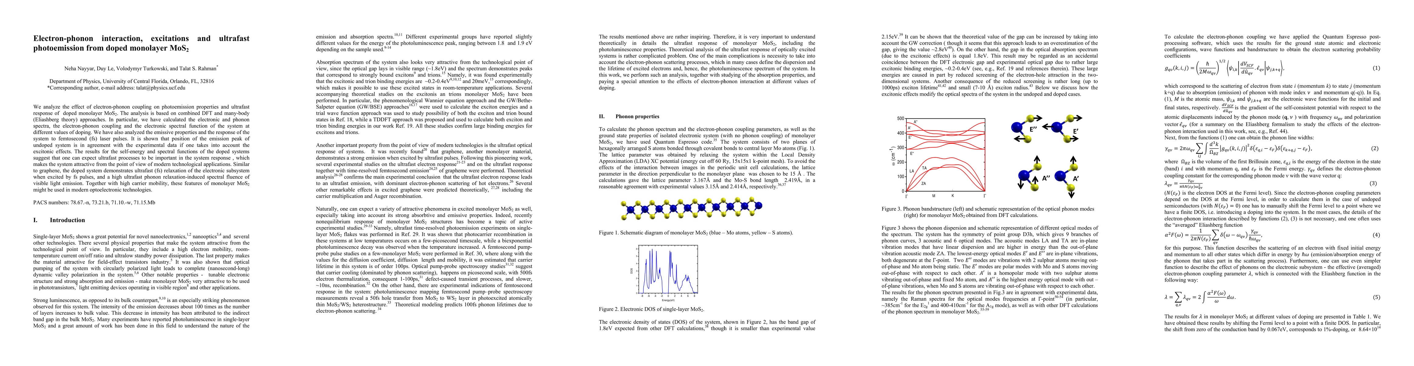 This paper investigates the electron-phonon interaction and ultrafast photoemission in doped monolayer MoS2 using DFT and many-body theory. It finds that ultrafast relaxation processes and high carrier mobility in the doped system make it promising for optoelectronic applications.