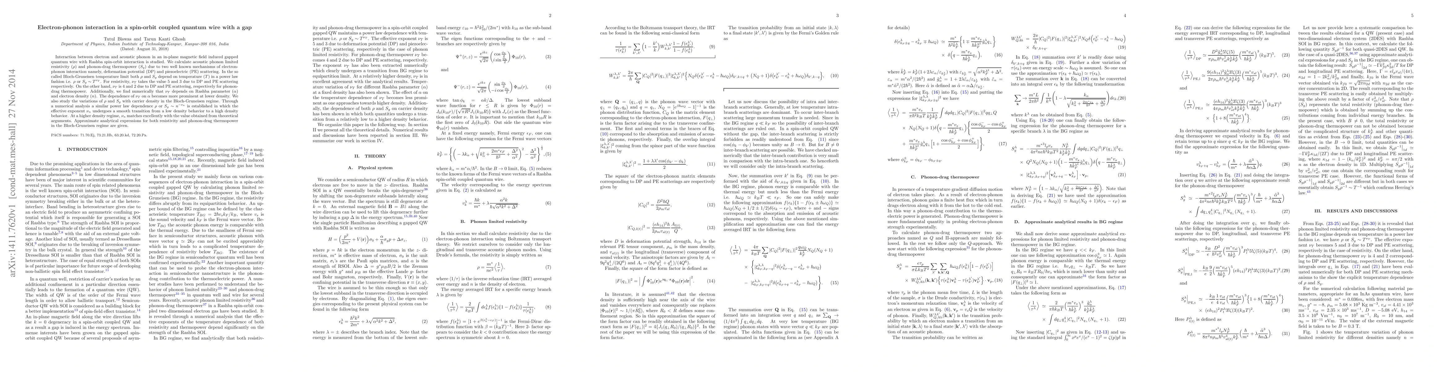 Interaction between electron and acoustic phonon in an in-plane magnetic field induced gapped quantum wire with Rashba spin-orbit interaction is studied. We calculate acoustic phonon limited resistivity ($\rho$) and phonon-drag thermopower ($S_g$) due to two well known mechanisms of electron-phonon interaction namely, deformation potential (DP) and piezoelectric (PE) scattering. In the so called Bloch-Gruneisen temperature limit both $\rho$ and $S_g$ depend on temperature ($T$) in a power law fashion i.e. $\rho$ or $S_g\sim T^{\nu_T}$. For resistivity, $\nu_T$ takes the value $5$ and $3$ due to DP and PE scattering respectively. On the other hand, $\nu_T$ is $4$ and $2$ due to DP and PE scattering, respectively for phonon-drag thermopower. Additionally, we find numerically that $\nu_T$ depends on Rashba parameter ($\alpha$) and electron density ($n$). The dependence of $\nu_T$ on $\alpha$ becomes more prominent at lower density. We also study the variations of $\rho$ and $S_g$ with carrier density in the Bloch-Gruneisen regime. Through a numerical analysis a similar power law dependence $\rho$ or $S_g\sim n^{-\nu_n}$ is established in which the effective exponent $\nu_n$ undergoes a smooth transition from a low density behavior to a high density behavior. At a higher density regime, $\nu_n$ matches excellently with the value obtained from theoretical arguments. Approximate analytical expressions for both resistivity and phonon-drag thermopower in the Bloch-Gruneisen regime are given.
