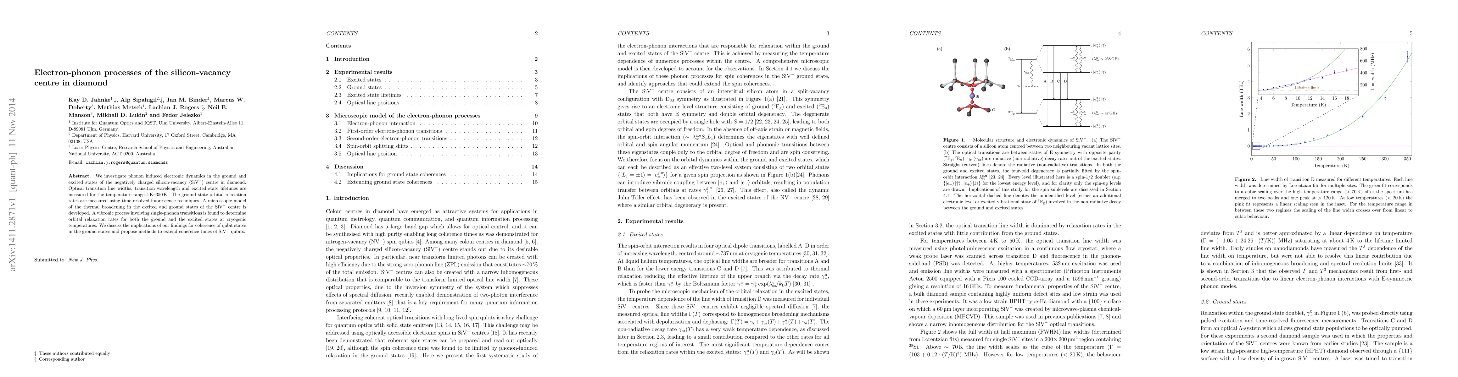The paper examines the silicon-vacancy ($mathrm{SiV}^-$) centre in diamond, measuring optical transition properties at varying temperatures. A microscopic model of thermal broadening in its excited and ground states is developed, revealing single-phonon transitions influence orbital relaxation rates. Implications for $mathrm{SiV}^-$ qubit coherence are discussed, with suggestions to prolong coherence times.