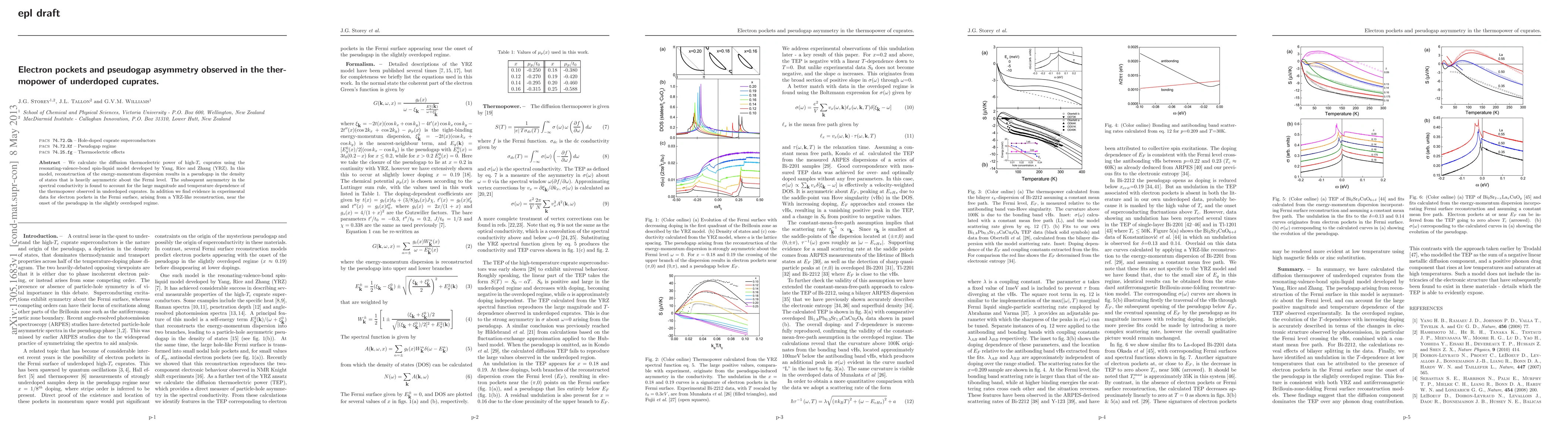 This study uses the YRZ model to explain the thermopower in underdoped cuprates, revealing a pseudogap asymmetry that correlates with the observed large thermopower magnitude and temperature dependence. Experimental evidence also supports the presence of electron pockets in the Fermi surface near the pseudogap onset.