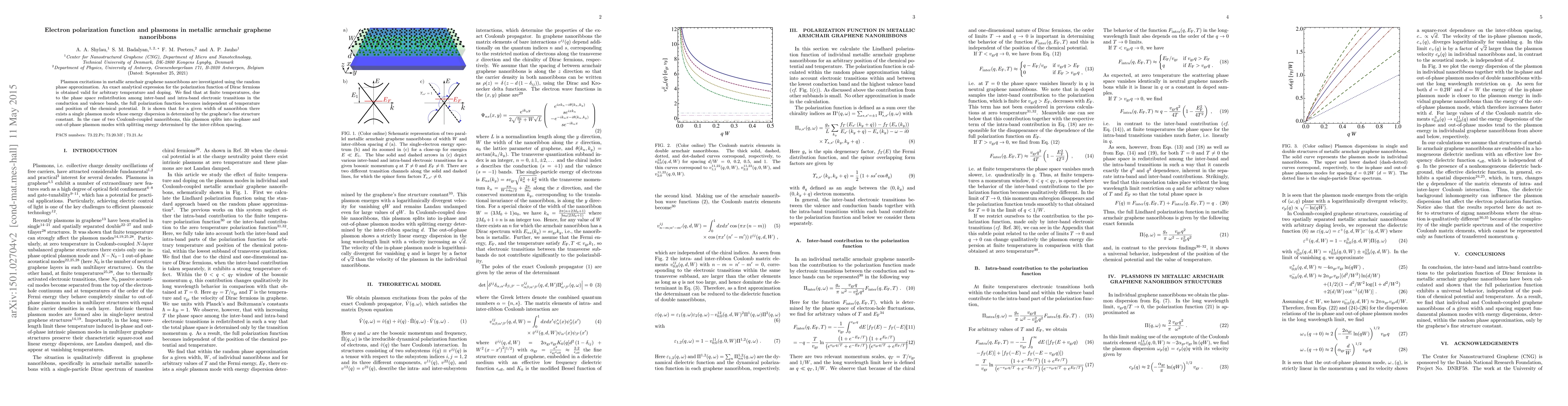 This paper investigates the polarization function of metallic armchair graphene nanoribbons, revealing that at finite temperatures, it becomes temperature-independent due to electronic transitions. It concludes that a single plasmon mode exists for a given nanoribbon width, with its dispersion linked to the fine structure constant, and Coulomb coupling causes this mode to split into in-phase and out-of-phase modes depending on inter-ribbon spacing.