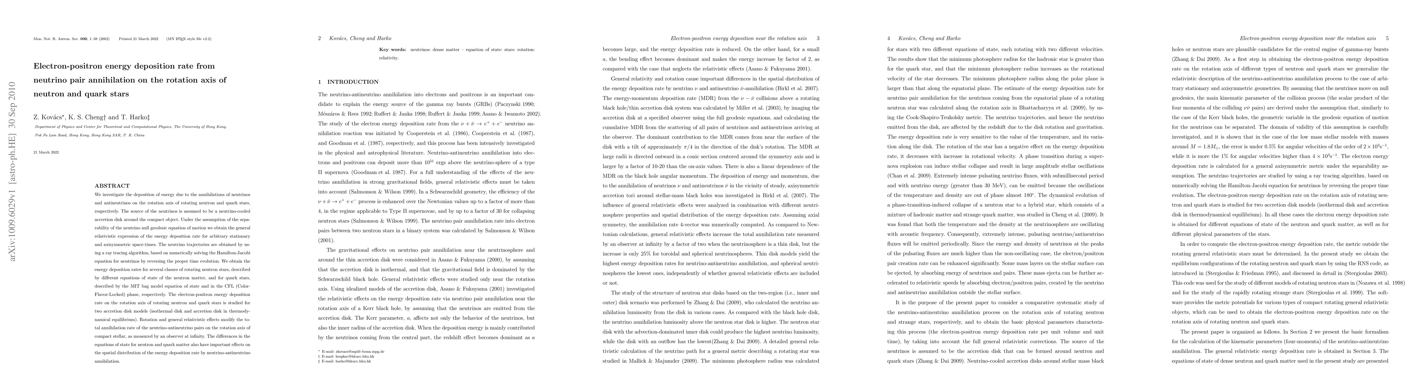 This paper investigates the energy deposition from neutrino-antineutrino annihilations on the rotation axis of neutron and quark stars, focusing on the effects of rotation and general relativity on the process. It employs a ray tracing algorithm to determine the energy deposition rates for various star models and accretion disk scenarios.