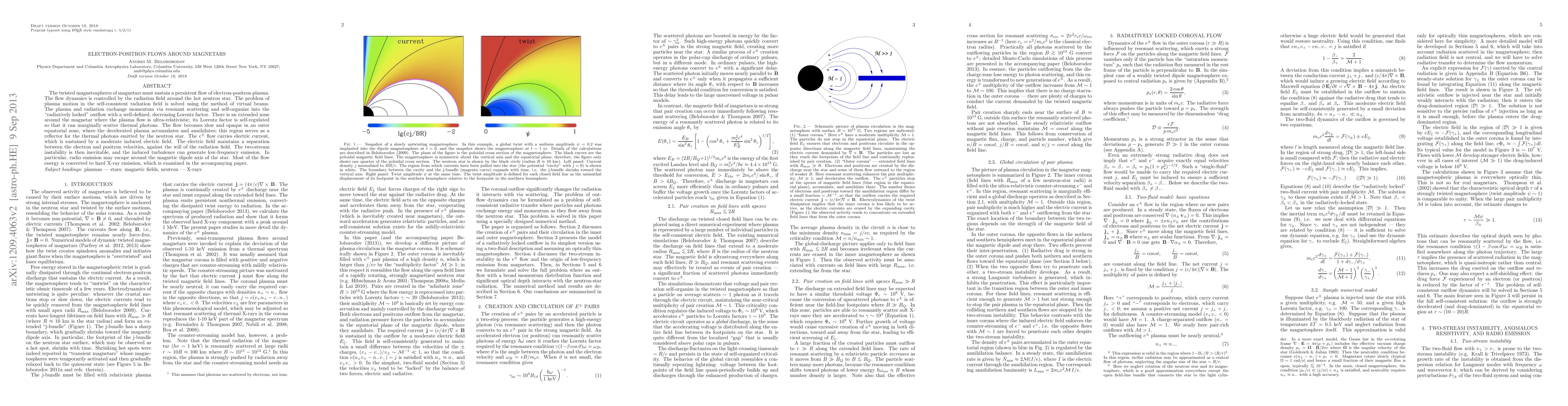 The twisted magnetospheres of magnetars must sustain a persistent flow of electron-positron plasma. The flow dynamics is controlled by the radiation field around the hot neutron star. The problem of plasma motion in the self-consistent radiation field is solved using the method of virtual beams. The plasma and radiation exchange momentum via resonant scattering and self-organize into the "radiatively locked" outflow with a well-defined, decreasing Lorentz factor. There is an extended zone around the magnetar where the plasma flow is ultra-relativistic; its Lorentz factor is self-regulated so that it can marginally scatter thermal photons. The flow becomes slow and opaque in an outer equatorial zone, where the decelerated plasma accumulates and annihilates; this region serves as a reflector for the thermal photons emitted by the neutron star. The e+- flow carries electric current, which is sustained by a moderate induced electric field. The electric field maintains a separation between the electron and positron velocities, against the will of the radiation field. The two-stream instability is then inevitable, and the induced turbulence can generate low-frequency emission. In particular, radio emission may escape around the magnetic dipole axis of the star. Most of the flow energy is converted to hard X-ray emission, which is examined in the accompanying paper.