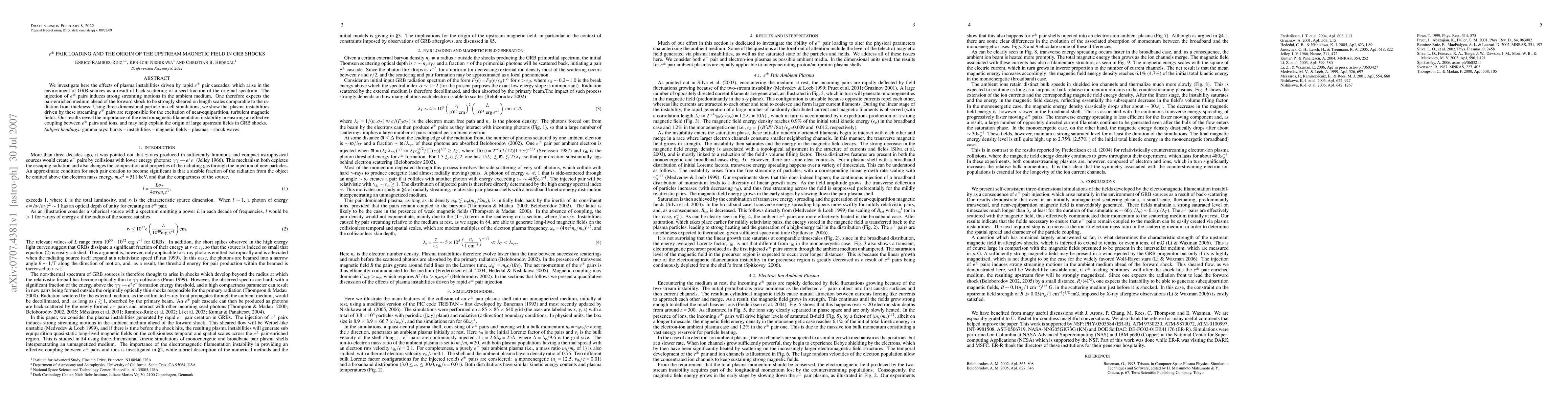 This paper investigates how electron-positron pair cascades in the environment of GRB sources lead to plasma instabilities, which generate turbulent magnetic fields. Using simulations, it demonstrates that these instabilities are crucial for the coupling between pairs and ions, potentially explaining the origin of large upstream magnetic fields in GRB shocks.