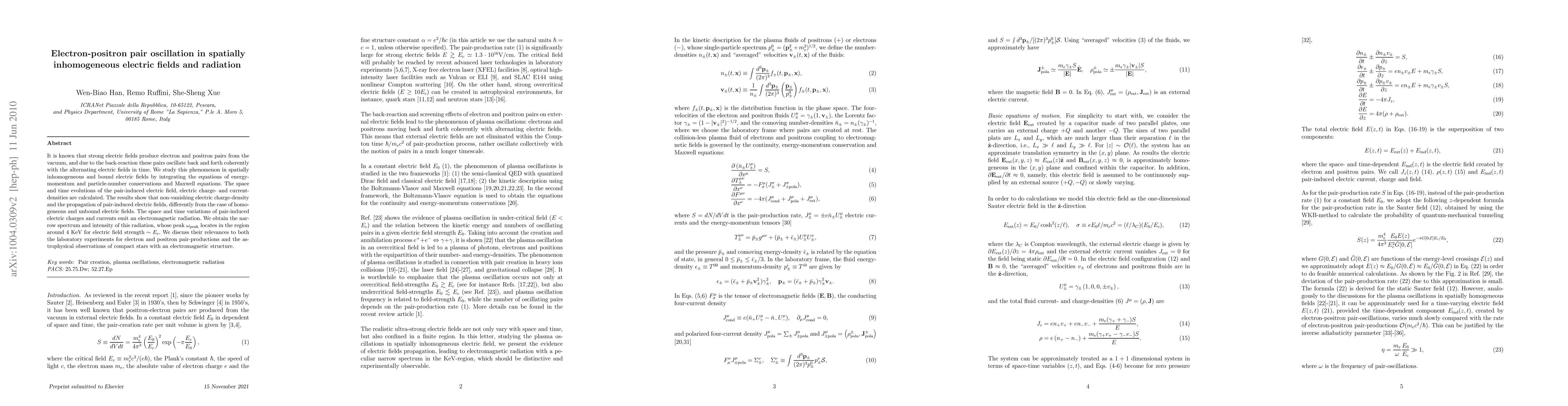 This paper investigates electron-positron pair oscillations in spatially inhomogeneous electric fields, revealing coherent oscillations and non-vanishing charge-density. The study calculates the space and time evolution of pair-induced electric fields and radiation, finding a peak electromagnetic radiation frequency around 4 keV for strong electric fields, relevant to both laboratory and astrophysical contexts.