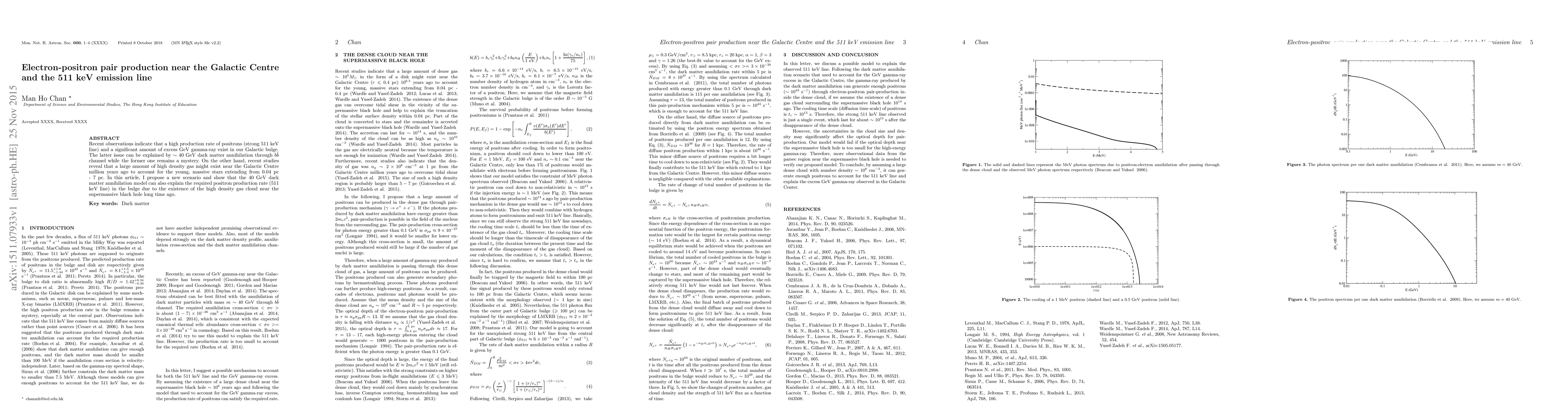 This paper proposes a new scenario where the high production rate of positrons, leading to the 511 keV emission line, near the Galactic Centre can be explained by the 40 GeV dark matter annihilation model, facilitated by a high-density gas cloud that existed near the supermassive black hole millions of years ago. This model also accounts for the observed GeV gamma-ray excess.