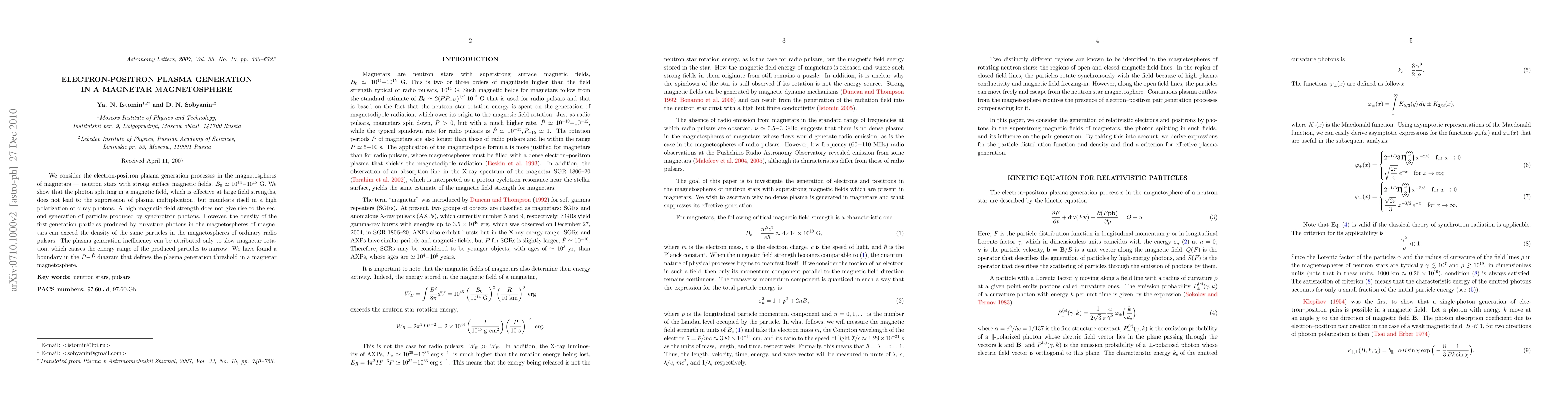 We consider the electron-positron plasma generation processes in the magnetospheres of magnetars - neutron stars with strong surface magnetic fields, B = 10^(14) - 10^(15) G. We show that the photon splitting in a magnetic field, which is effective at large field strengths, does not lead to the suppression of plasma multiplication, but manifests itself in a high polarization of gamma-ray photons. A high magnetic field strength does not give rise to the second generation of particles produced by synchrotron photons. However, the density of the first-generation particles produced by curvature photons in the magnetospheres of magnetars can exceed the density of the same particles in the magnetospheres of ordinary radio pulsars. The plasma generation inefficiency can be attributed only to slow magnetar rotation, which causes the energy range of the produced particles to narrow. We have found a boundary in the P - Pdot diagram that defines the plasma generation threshold in a magnetar magnetosphere.