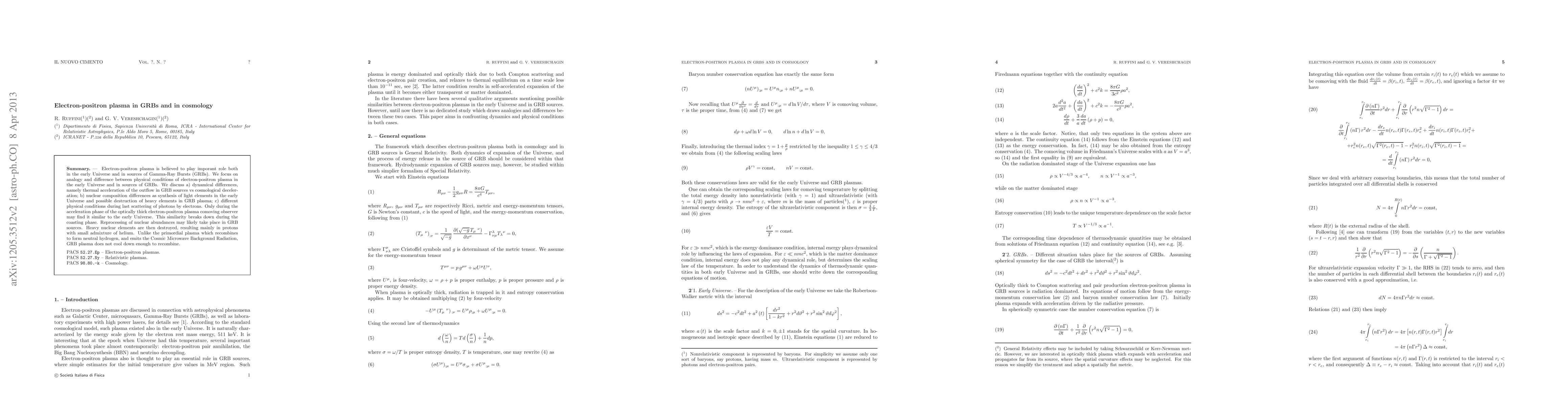 Researchers explore electron-positron plasma in Gamma-Ray Bursts (GRBs) and the early Universe, finding similarities during acceleration but differences due to cooling and reprocessing of nuclear elements.