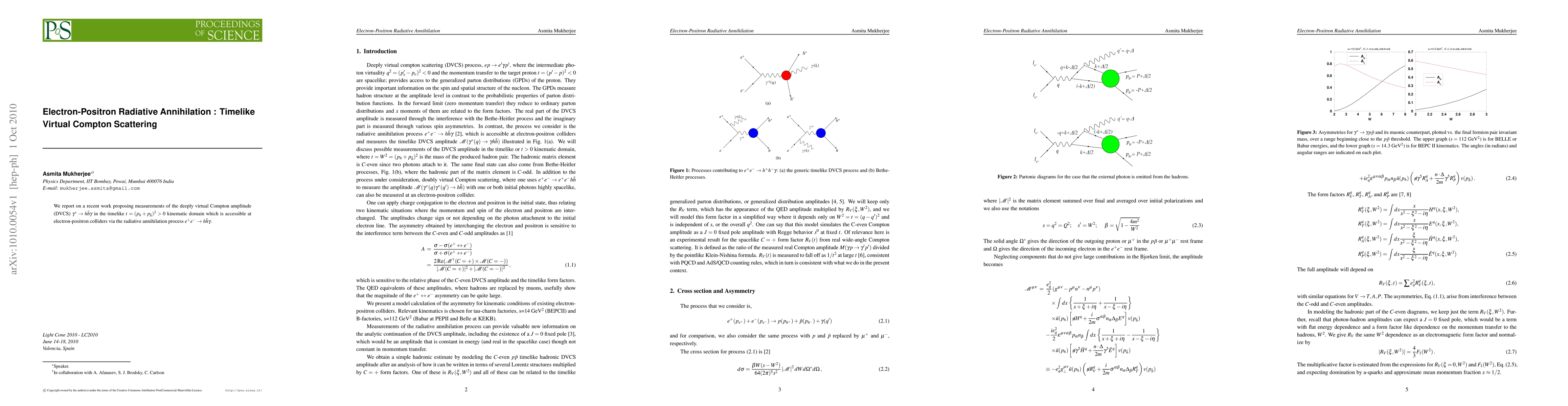 We report on a recent work proposing measurements of the deeply virtual Compton amplitude (DVCS) $\gamma^* \to h \bar h \gamma$ in the timelike kinematic domain which is accessible at electron-positron colliders via the radiative annihilation process $e^+ e^- \to h \bar h \gamma$.