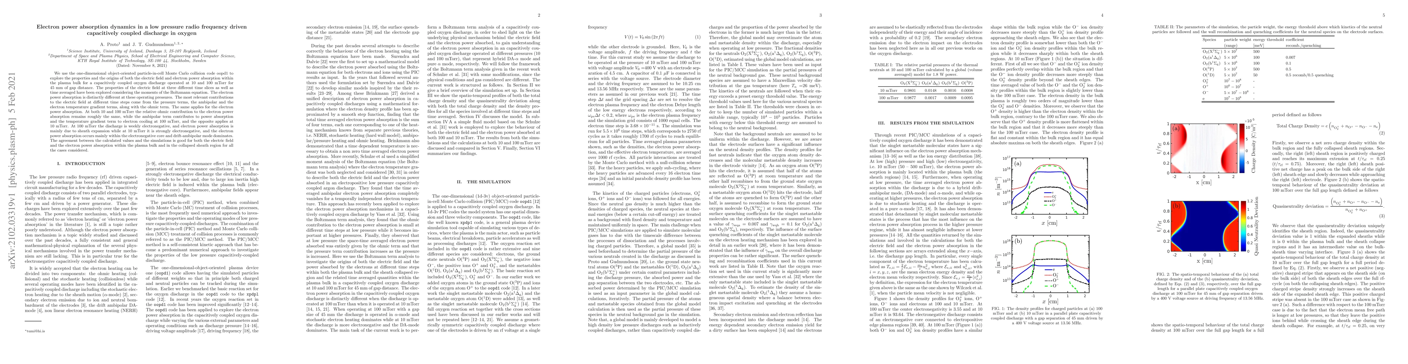This study uses a particle-in-cell Monte Carlo code to analyze electron power absorption dynamics in low-pressure oxygen discharges, revealing distinct behaviors at 10 and 100 mTorr. The analysis shows that while ohmic contributions remain consistent, ambipolar and temperature gradient terms vary, leading to different dominant mechanisms for electron power absorption at the two pressures.