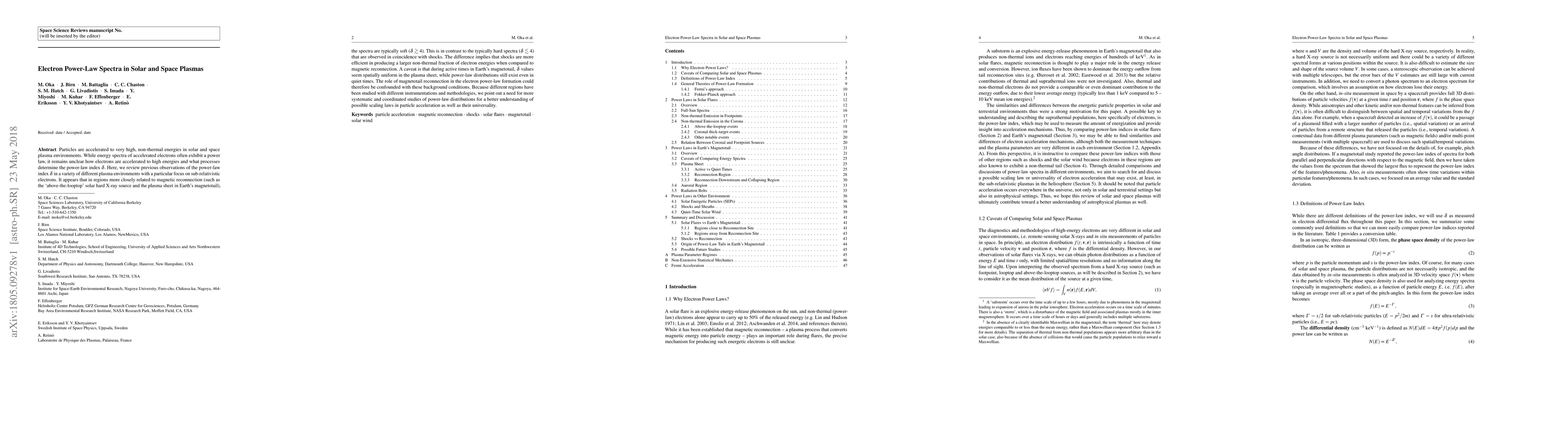 Particles are accelerated to very high, non-thermal energies in solar and space plasma environments. While energy spectra of accelerated electrons often exhibit a power law, it remains unclear how electrons are accelerated to high energies and what processes determine the power-law index $\delta$. Here, we review previous observations of the power-law index $\delta$ in a variety of different plasma environments with a particular focus on sub-relativistic electrons. It appears that in regions more closely related to magnetic reconnection (such as the `above-the-looptop' solar hard X-ray source and the plasma sheet in Earth's magnetotail), the spectra are typically soft ($\delta \gtrsim$ 4). This is in contrast to the typically hard spectra ($\delta \lesssim$ 4) that are observed in coincidence with shocks. The difference implies that shocks are more efficient in producing a larger non-thermal fraction of electron energies when compared to magnetic reconnection. A caveat is that during active times in Earth's magnetotail, $\delta$ values seem spatially uniform in the plasma sheet, while power-law distributions still exist even in quiet times. The role of magnetotail reconnection in the electron power-law formation could therefore be confounded with these background conditions. Because different regions have been studied with different instrumentations and methodologies, we point out a need for more systematic and coordinated studies of power-law distributions for a better understanding of possible scaling laws in particle acceleration as well as their universality.