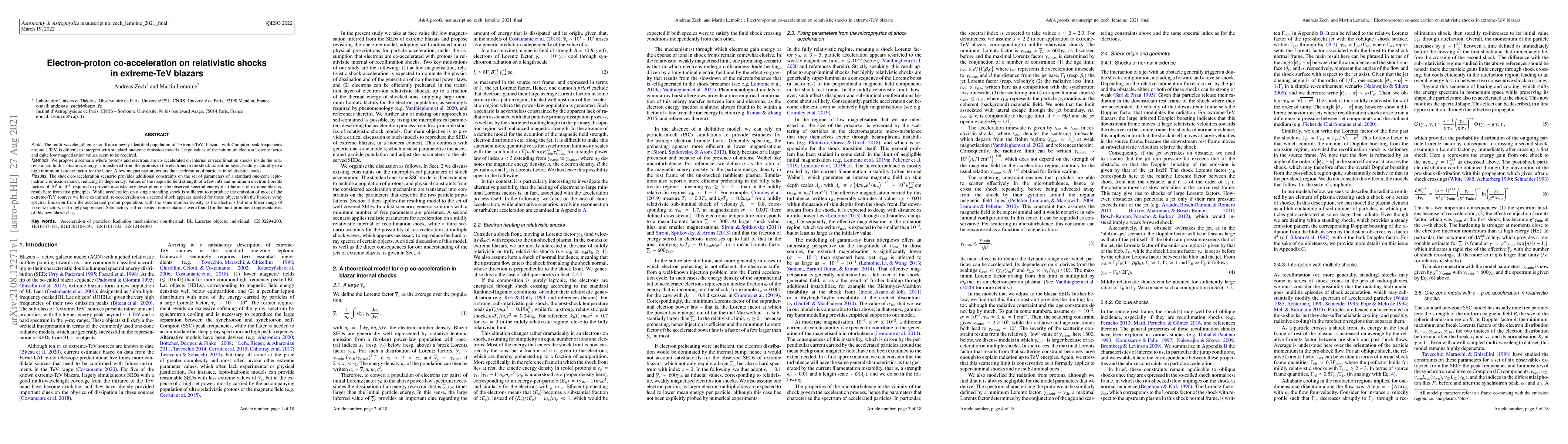 A new model proposes that protons and electrons are co-accelerated on internal shocks in relativistic jets of extreme-TeV blazars, requiring high minimum electron Lorentz factors and low magnetization values.