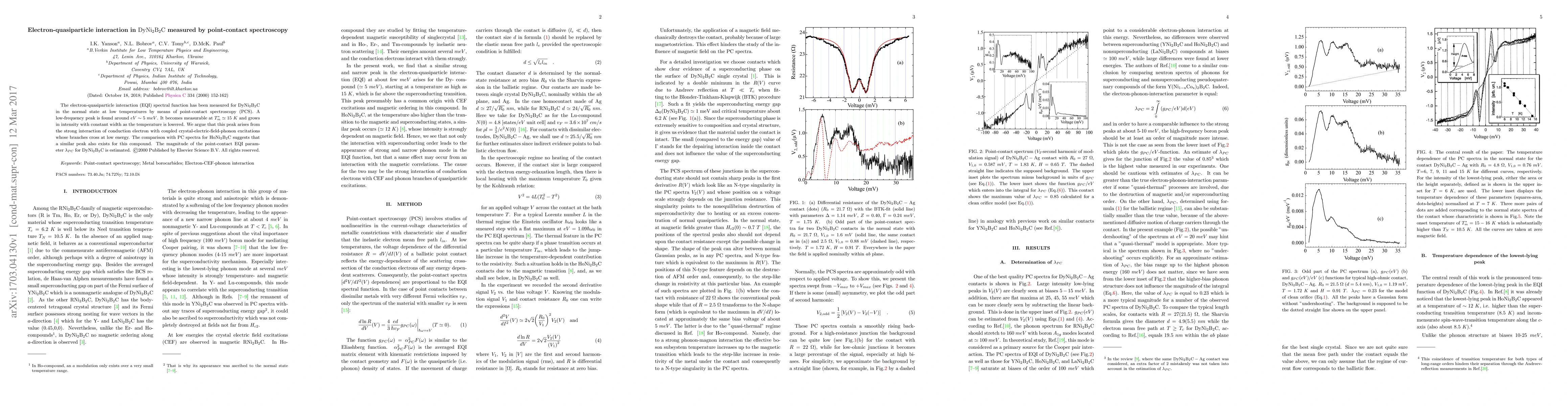 The electron-quasiparticle interaction (EQI) spectral function has been measured for $\rm DyNi_2B_2C$ in the normal state at low temperatures by means of point-contact spectroscopy (PCS). A low-frequency peak is found around $eV\sim 5\ meV$. It becomes measurable at $T_m^*\simeq 15\ K$ and grows in intensity with constant width as the temperature is lowered. We argue that this peak arises from the strong interaction of conduction electron with coupled crystal-electric-field-phonon excitations whose branches cross at low energy. The comparison with PC spectra for $\rm HoNi_2B_2C$ suggests that a similar peak also exists for this compound. The magnitude of the point-contact EQI parameter $\lambda_{PC}$ for $\rm DyNi_2B_2C$ is estimated. $\copyright$2000 Published by Elsevier Science B.V. All rights reserved.