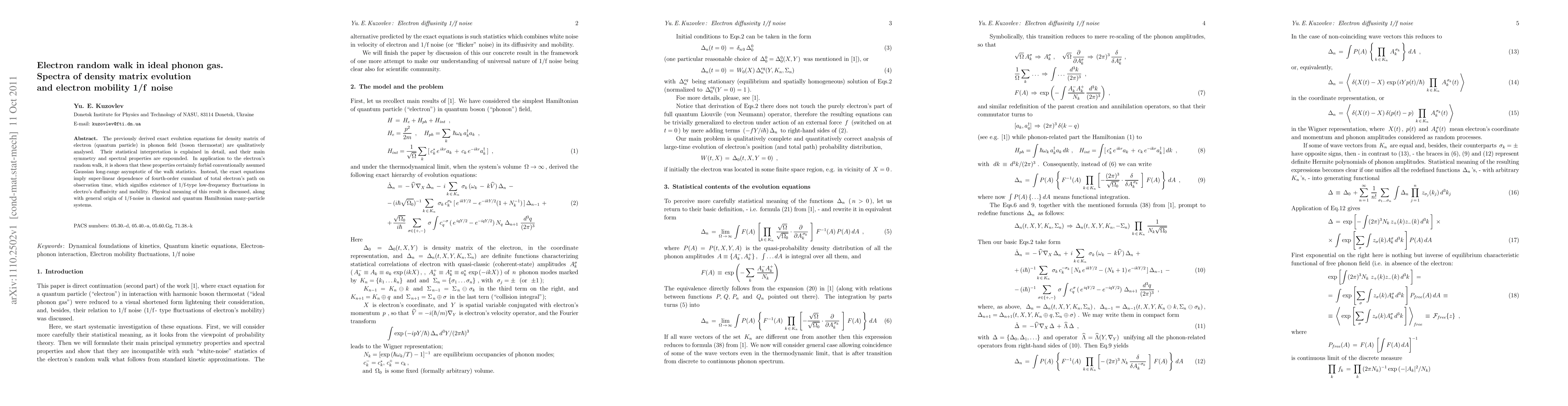 The previously derived exact evolution equations for density matrix of electron (quantum particle) in phonon field (boson thermostat) are qualitatively analysed. Their statistical interpretation is explained in detail, and their main symmetry and spectral properties are expounded. In application to the electron's random walk, it is shown that these properties certaimly forbid conventionally assumed Gaussian long-range asymptotic of the walk statistics. Instead, the exact equations imply super-linear dependence of fourth-order cumulant of total electron's path on observation time, which signifies existence of 1/f-type low-frequency fluctuations in electro's diffusivity and mobility. Physical meaning of this result is discussed, along with general origin of 1/f-noise in classical and quantum Hamiltonian many-particle systems.