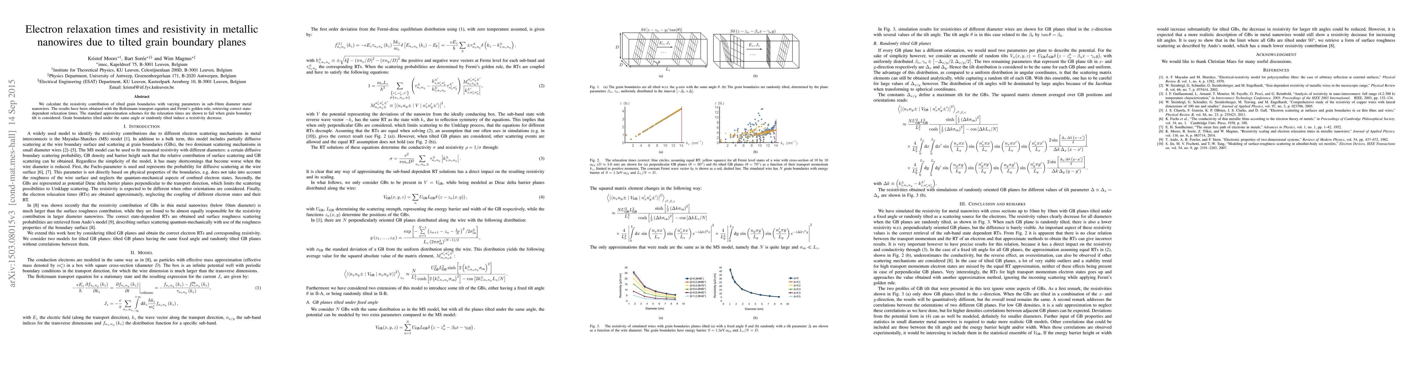 This study calculates the resistivity in metallic nanowires due to tilted grain boundaries, revealing that standard relaxation time approximations fail when considering tilt. The research shows that both uniform and random tilt angles reduce resistivity.