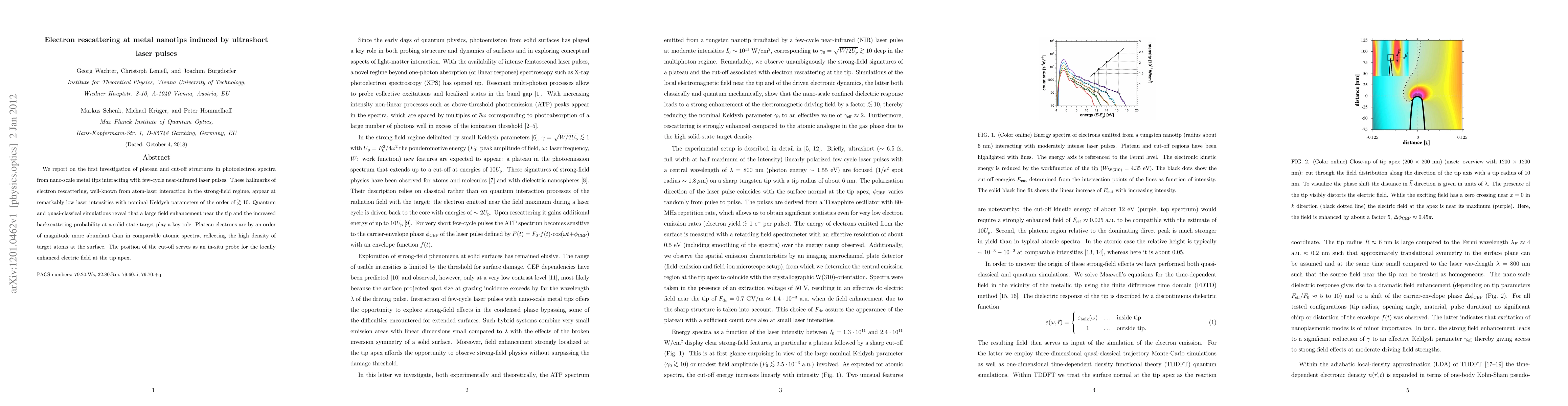 This study investigates electron rescattering phenomena in metal nanotips exposed to ultrashort laser pulses, revealing plateau and cut-off structures in photoelectron spectra at low laser intensities. The findings highlight the significant role of field enhancement near the tip and increased backscattering probability in solid-state targets.