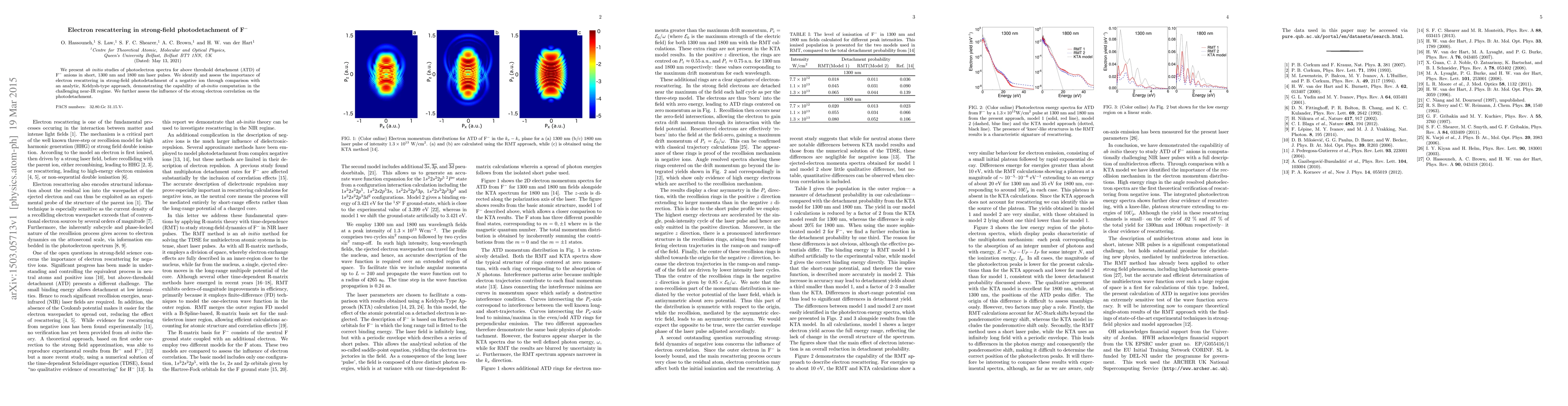 We present ab initio studies of photoelectron spectra for above threshold detachment (ATD) of F$^-$ anions in short, 1300 nm and 1800 nm laser pulses. We identify and assess the importance of electron rescattering in strong-field photodetachment of a negative ion through comparison with an analytic, Keldysh-type approach, demonstrating the capability of ab-initio computation in the challenging near-IR regime. We further assess the influence of the strong electron correlation on the photodetachment.