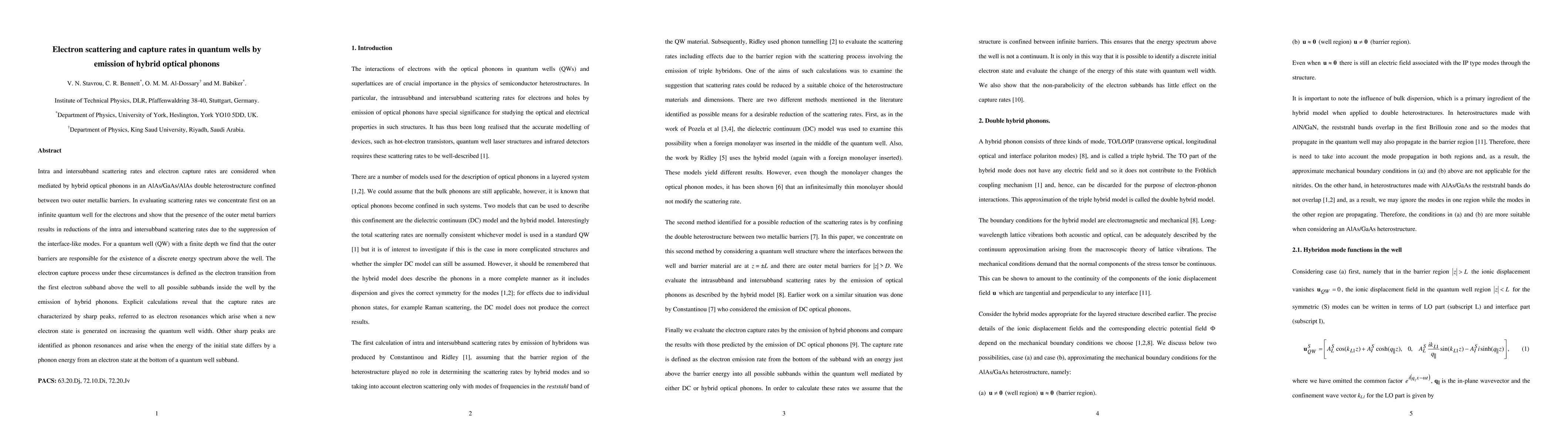 Intra and intersubband scattering rates and electron capture rates are considered when mediated by hybrid optical phonons in an AlAs/GaAs/AlAs double heterostructure confined between two outer metallic barriers. In evaluating scattering rates we concentrate first on an infinite quantum well for the electrons and show that the presence of the outer metal barriers results in reductions of the intra and intersubband scattering rates due to the suppression of the interface-like modes. For a quantum well (QW) with a finite depth we find that the outer barriers are responsible for the existence of a discrete energy spectrum above the well. The electron capture process under these circumstances is defined as the electron transition from the first electron subband above the well to all possible subbands inside the well by the emission of hybrid phonons. Explicit calculations reveal that the capture rates are characterized by sharp peaks, referred to as electron resonances which arise when a new electron state is generated on increasing the quantum well width. Other sharp peaks are identified as phonon resonances and arise when the energy of the initial state differs by a phonon energy from an electron state at the bottom of a quantum well subband.