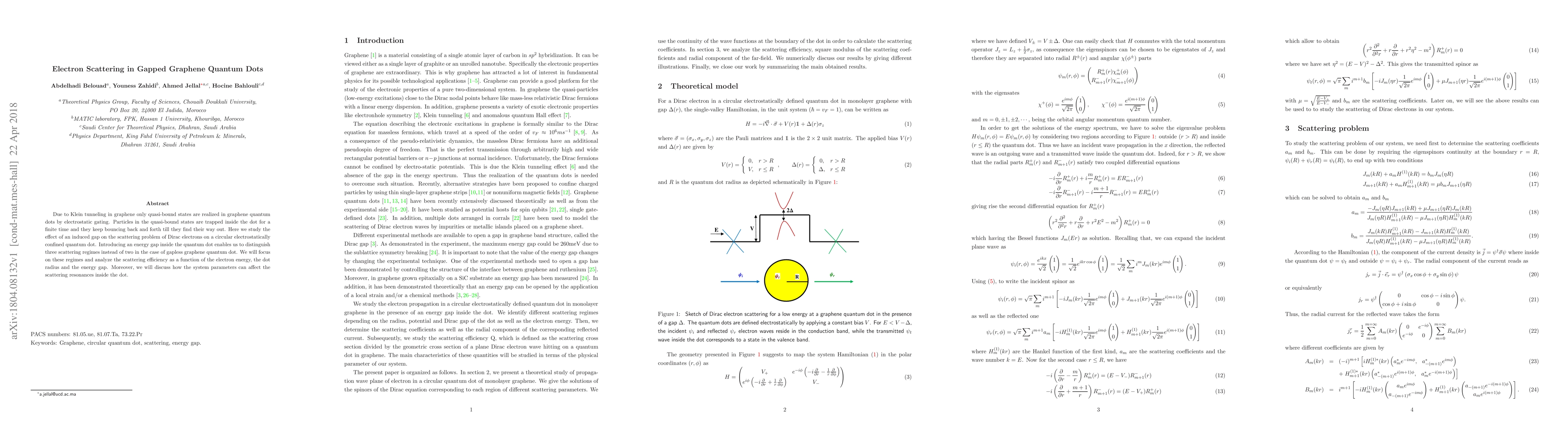 This study investigates electron scattering in graphene quantum dots with an induced energy gap, revealing three distinct scattering regimes compared to gapless dots. The research analyzes scattering efficiency relative to electron energy, dot radius, and energy gap, and discusses the influence of system parameters on scattering resonances.