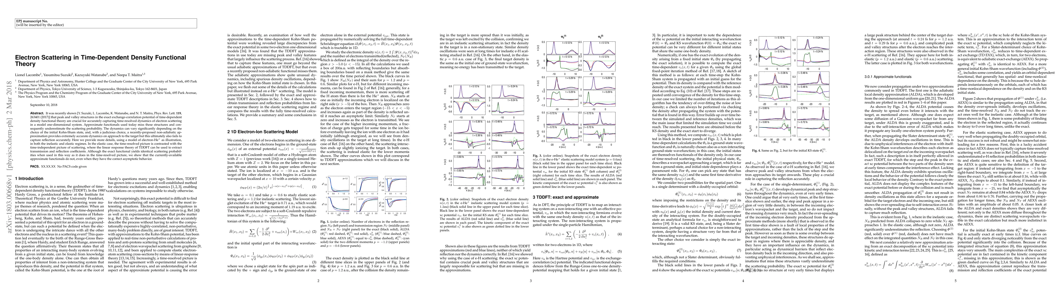 It was recently shown [Y. Suzuki, L. Lacombe, K. Watanabe, and N. T. Maitra, Phys. Rev. Lett. 119, 263401 (2017)] that peak and valley structures in the exact exchange-correlation potential of time-dependent density functional theory are crucial for accurately capturing time-resolved dynamics of electron scattering in a model one-dimensional system. Approximate functionals used today miss these structures and con- sequently underestimate the scattering probability. The dynamics can vary significantly depending on the choice of the initial Kohn-Sham state, and, with a judicious choice, a recently-proposed non-adiabatic ap- proximation provides extremely accurate dynamics on approach to the target but this ultimately also fails to capture reflection accurately. Here we provide more details, using a model of electron-He + as illustration, in both the inelastic and elastic regimes. In the elastic case, the time-resolved picture is contrasted with the time-independent picture of scattering, where the linear response theory of TDDFT can be used to extract transmission and reflection coefficients. Although the exact functional yields identical scattering probabil- ities when used in this way as it does in the time-resolved picture, we show that the currently-available approximate functionals do not, even when they have the correct asymptotic behavior.