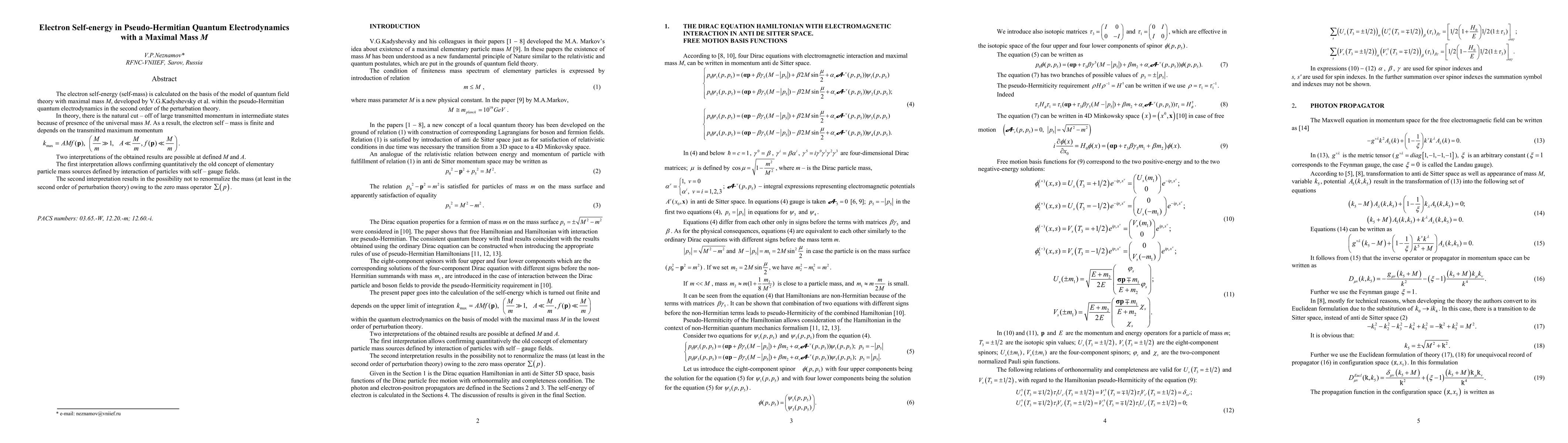 The electron self-energy (self-mass) is calculated on the basis of the model of quantum field theory with maximal mass M, developed by V.G.Kadyshevsky et al. within the pseudo-Hermitian quantum electrodynamics in the second order of the perturbation theory. In theory, there is the natural cut-off of large transmitted momentum in intermediate states because of presence of the universal mass M. As a result, the electron self-mass is finite and depends on the transmitted maximum momentum. Two interpretations of the obtained results are possible at defined M and A. The first interpretation allows confirming quantitatively the old concept of elementary particle mass sources defined by interaction of particles with self-gauge fields. The second interpretation results in the possibility not to renormalize the mass (at least in the second order of perturbation theory) owing to the zero mass operator.