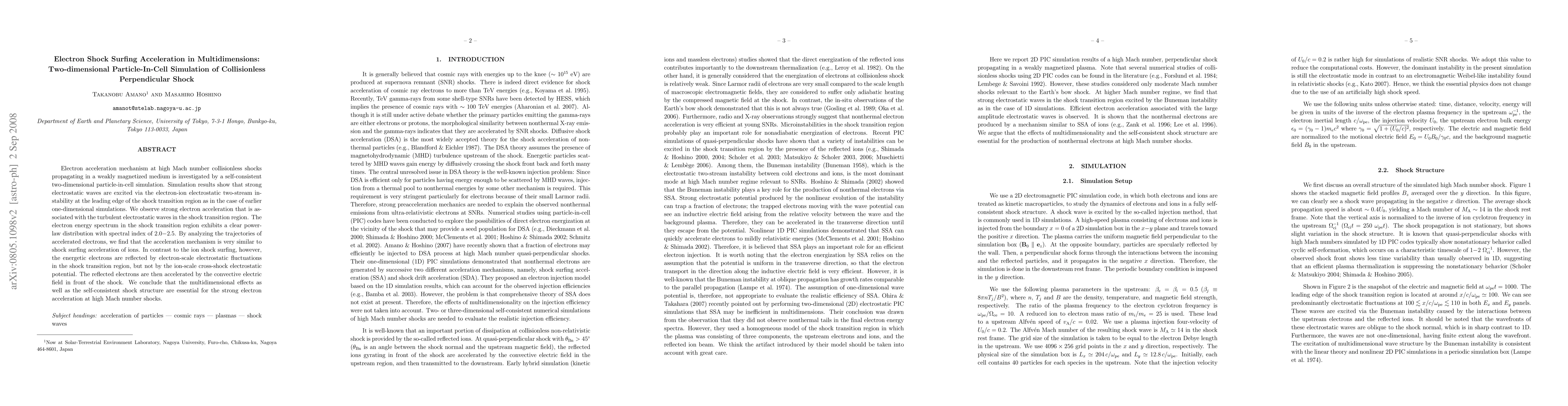 This paper investigates electron acceleration at high Mach number collisionless shocks using two-dimensional particle-in-cell simulations, revealing strong electrostatic waves and a power-law electron energy spectrum. The mechanism resembles shock surfing acceleration, where electrons are reflected by electron-scale electrostatic fluctuations and accelerated by the electric field in front of the shock.