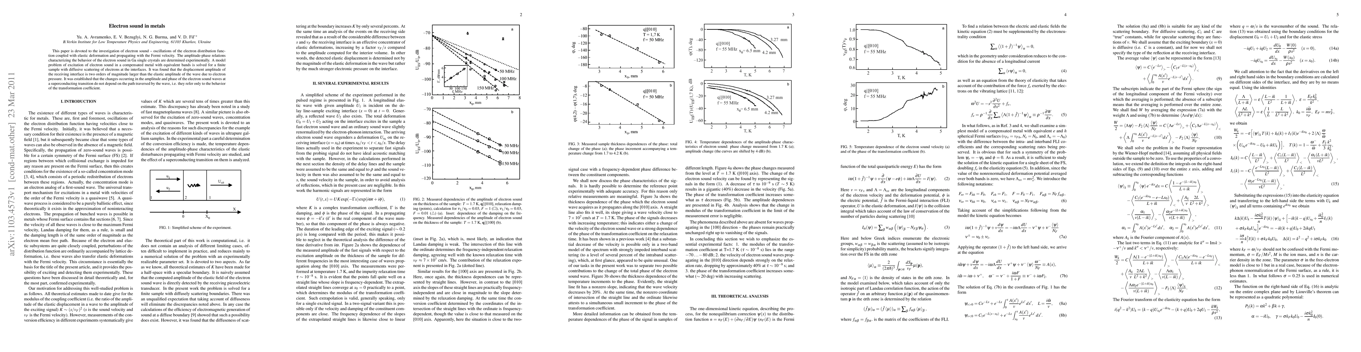 This paper is devoted to the investigation of electron sound -- oscillations of the electron distribution function coupled with elastic deformation and propagating with the Fermi velocity. The amplitude-phase relations characterizing the behavior of the electron sound in Ga single crystals are determined experimentally. A model problem of excitation of electron sound in a compensated metal with equivalent bands is solved for a finite sample with diffusive scattering of electrons at the interfaces. It was found that the displacement amplitude of the receiving interface is two orders of magnitude larger than the elastic amplitude of the wave due to electron pressure. It was established that the changes occurring in the amplitude and phase of the electron sound waves at a superconducting transition do not depend on the path traversed by the wave, i.e. they refer only to the behavior of the transformation coefficient.