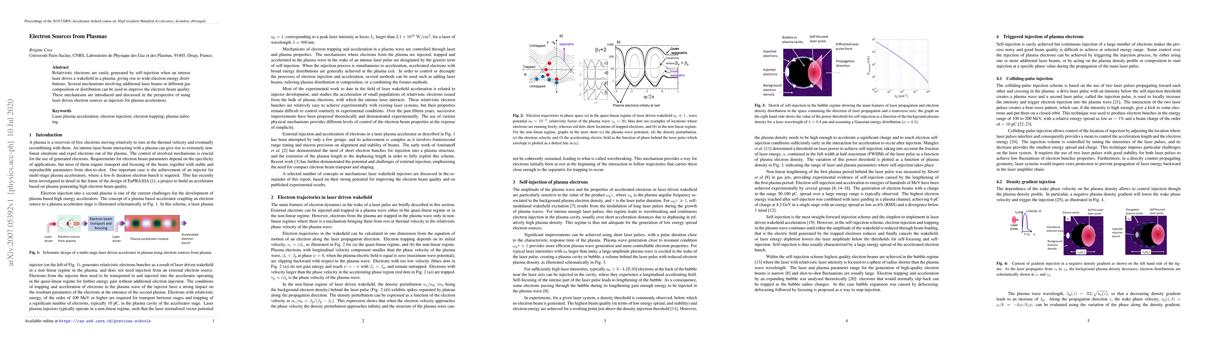 Laser-driven wakefield in a plasma generates relativistic electrons with wide energy distributions. Mechanisms to improve electron beam quality using additional laser beams or gas composition/distribution are discussed for use as injectors in plasma accelerators.