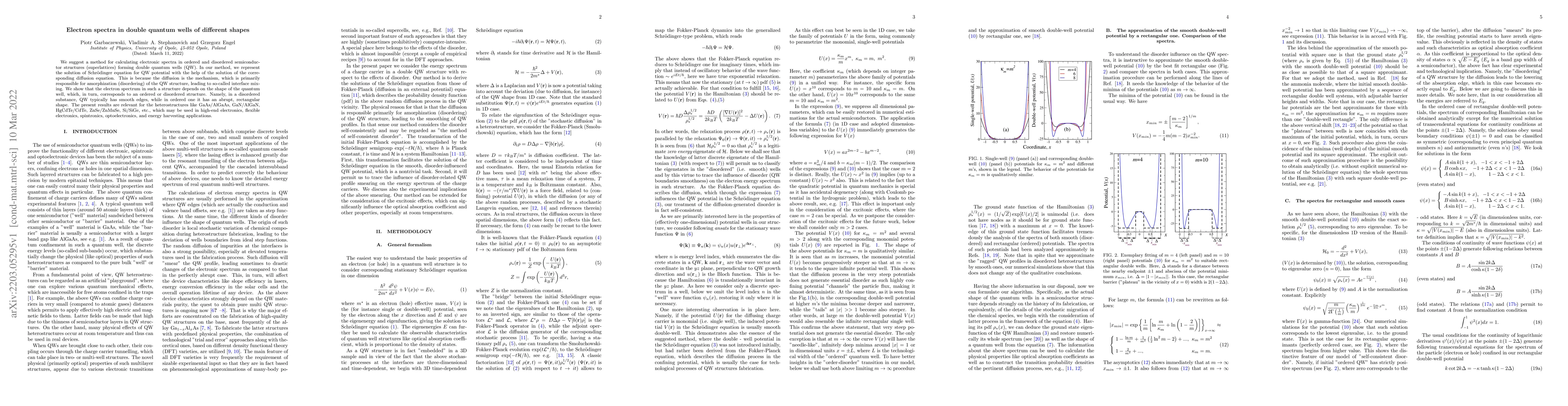 We suggest a method for calculating electronic spectra in ordered and disordered semiconductor structures (superlattices) forming double quantum wells (QW). In our method, we represent the solution of Schr\"odinger equation for QW potential with the help of the solution of the corresponding diffusion equation. This is because the diffusion is the mechanism, which is primarily responsible for amorphization (disordering) of the QW structure, leading to so-called interface mixing. We show that the electron spectrum in such a structure depends on the shape of the quantum well, which, in turn, corresponds to an ordered or disordered structure. Namely, in a disordered substance, QW typically has smooth edges, while in ordered one it has an abrupt, rectangular shape. The present results are relevant for the heterostructures like GaAs/AlGaAs, GaN/AlGaN, HgCdTe/CdTe, ZnSe/ZnMnSe, Si/SiGe, etc., which may be used in high-end electronics, flexible electronics, spintronics, optoelectronics, and energy harvesting applications.