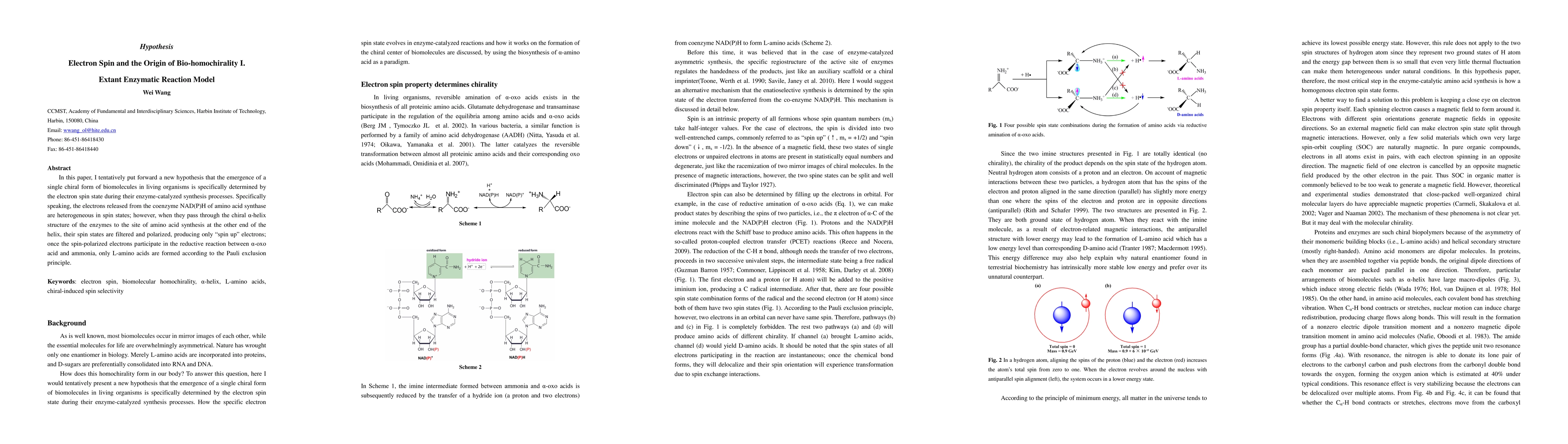 In this paper, I tentatively put forward a new hypothesis that the emergence of a single chiral form of biomolecules in living organisms is specifically determined by the electron spin state during their enzyme-catalyzed synthesis processes. Specifically speaking, the electrons released from the coenzyme NAD(P)H of amino acid synthase are heterogeneous in spin states; however, when they pass through the chiral alpha-helix structure of the enzymes to the site of amino acid synthesis at the other end of the helix, their spin states are filtered and polarized, producing only spin up electrons; once the spin-polarized electrons participate in the reductive reaction between alpha-oxo acid and ammonia, only L-amino acids are formed according to the Pauli exclusion principle.